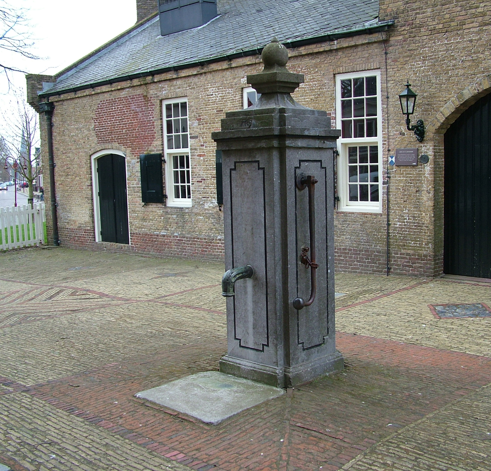 Natuurstenen waterpomp met bekroning, tussen de kerk...