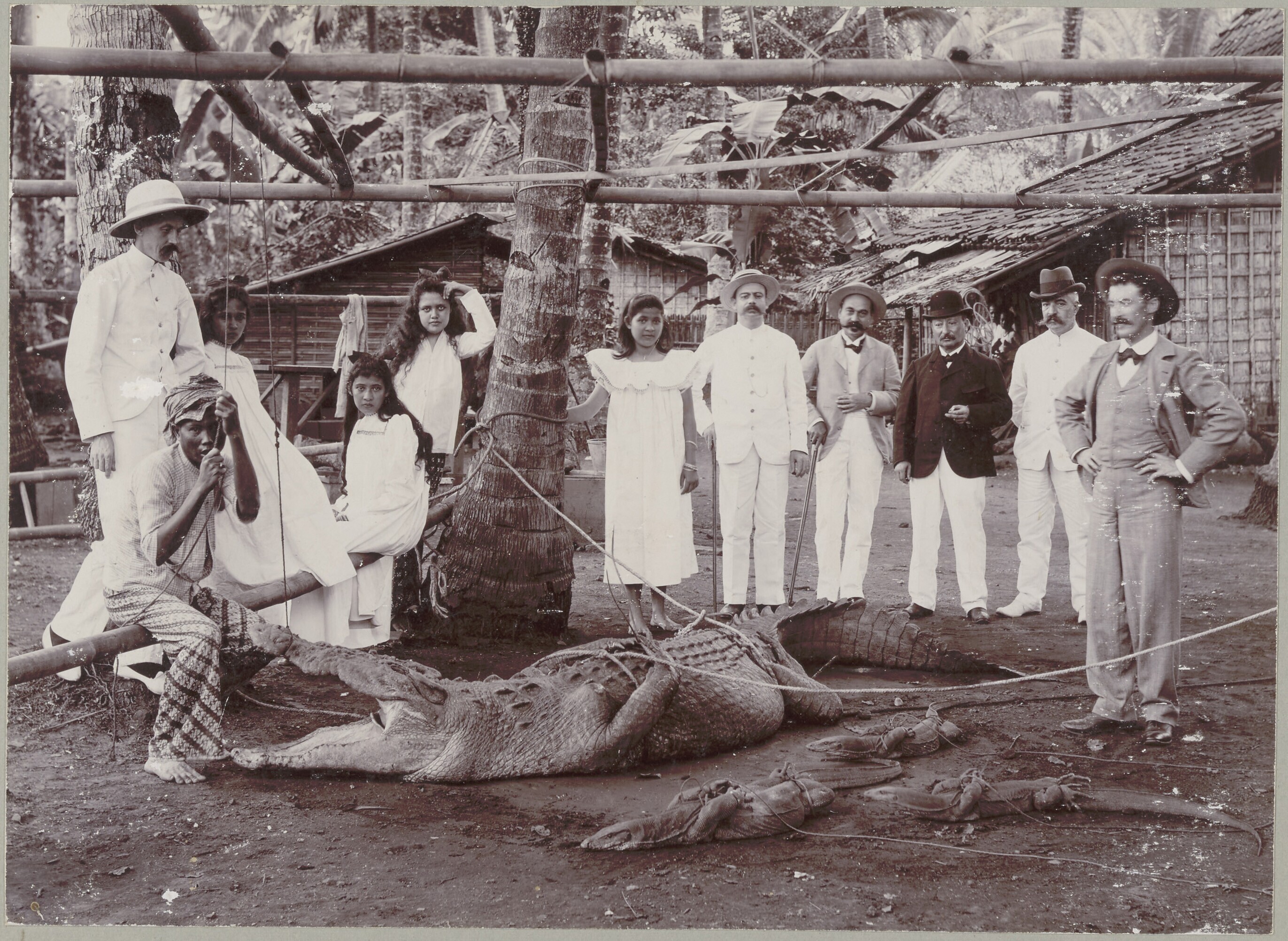 Groepsportret bij een gevangen krokodil en een driet...