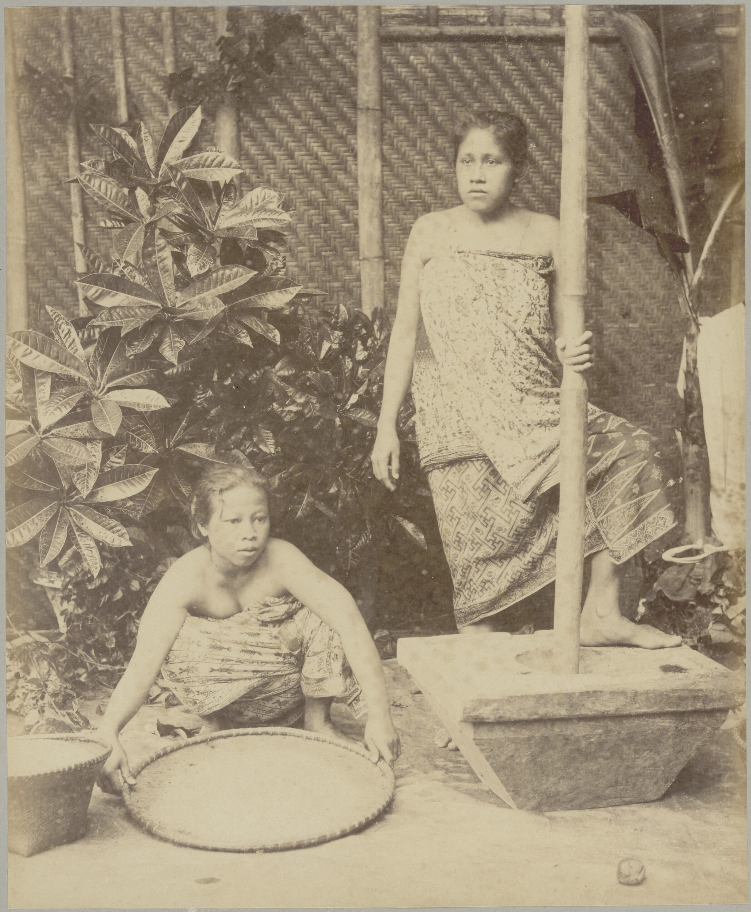 Studioportret van twee vrouwen tijdens het stampen e...