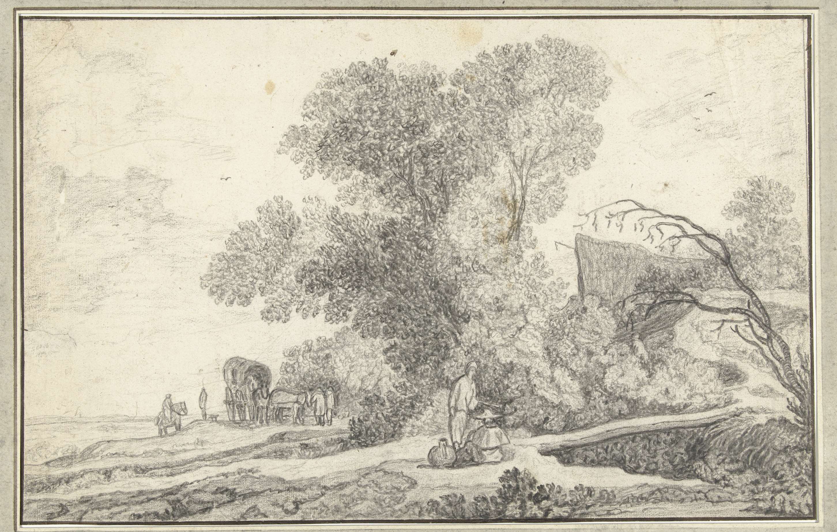 Landschap met boomgroep en huifkar