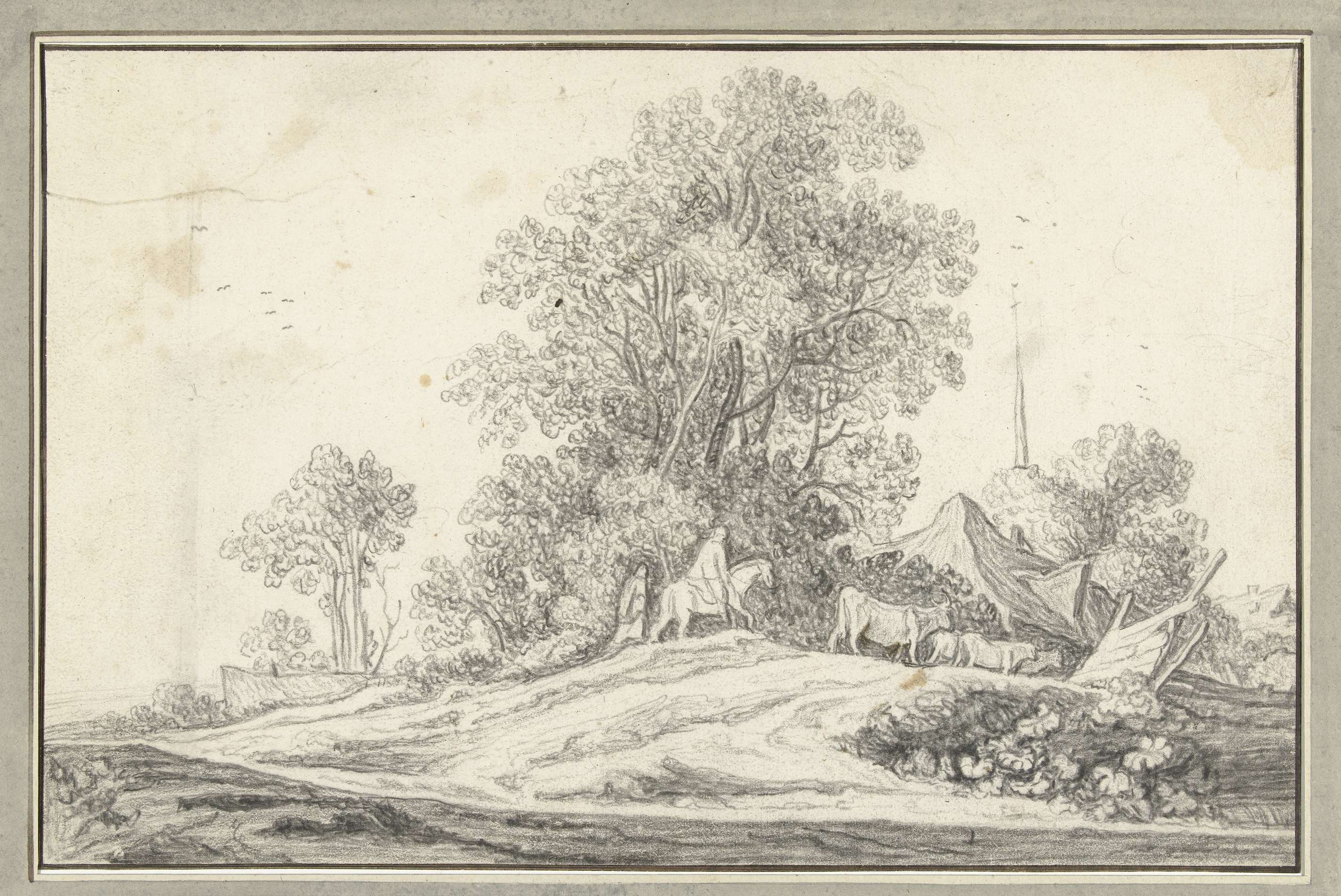Landschap met een ruiter en koeien voor een boomgroep