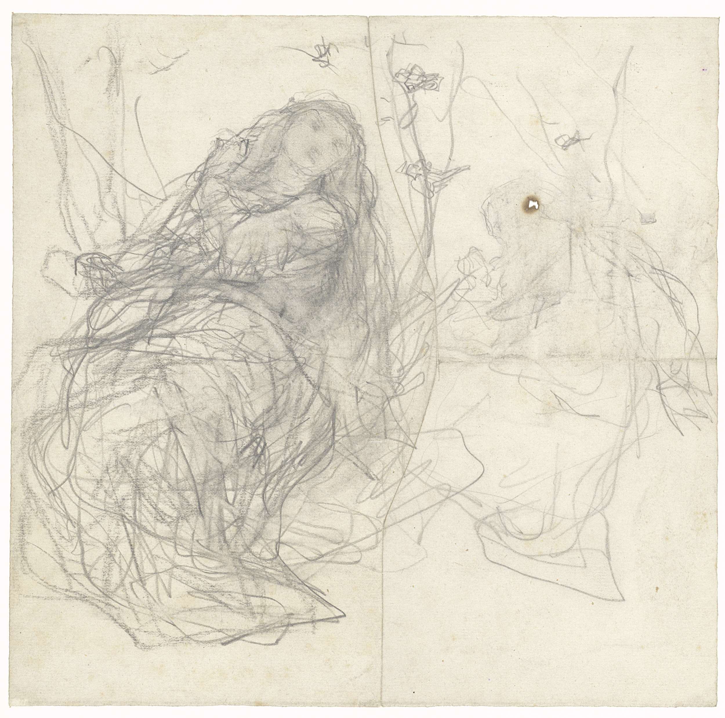 Twee studies van een zittende vrouw in een landschap