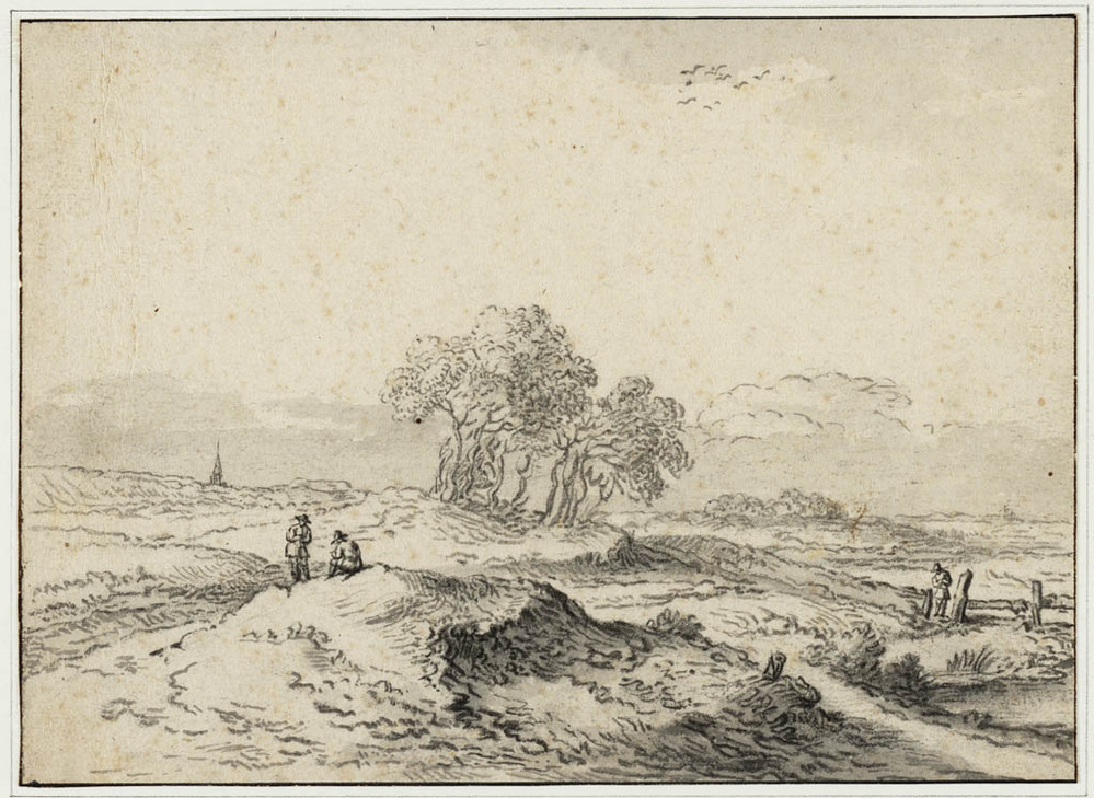 Duinlandschap met bomen en reizigers