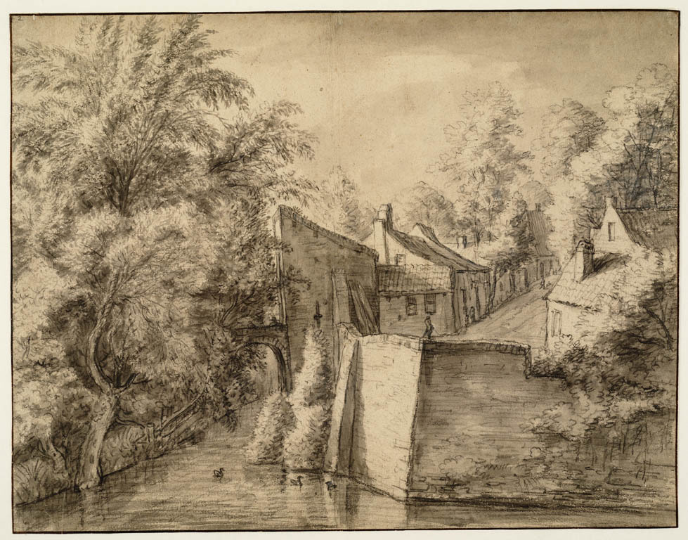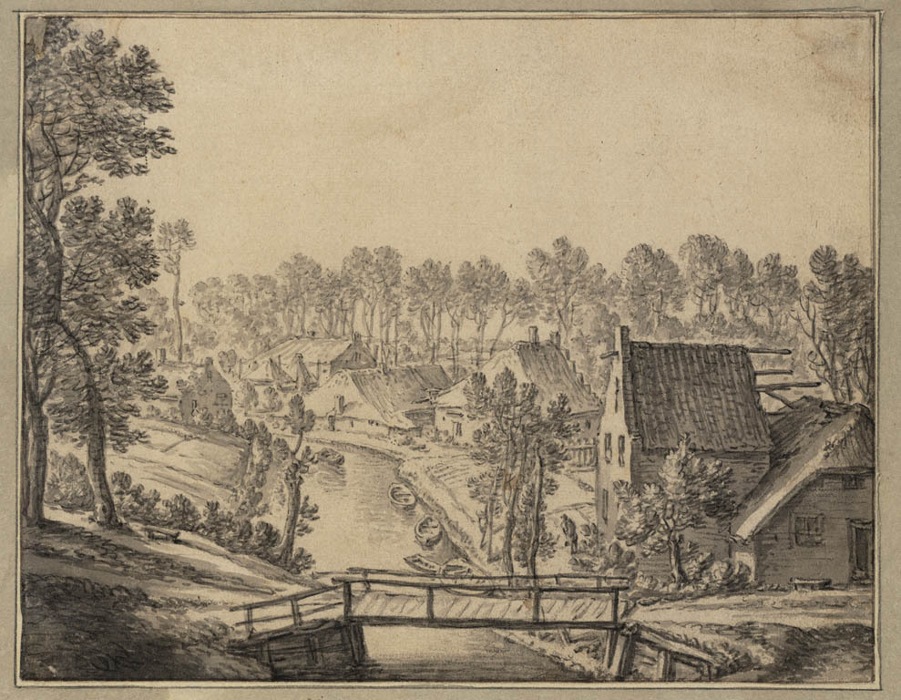 Een molen en verschillende huizen langs een vaart