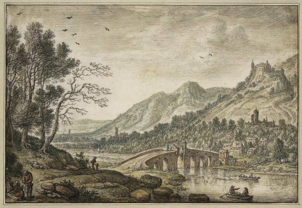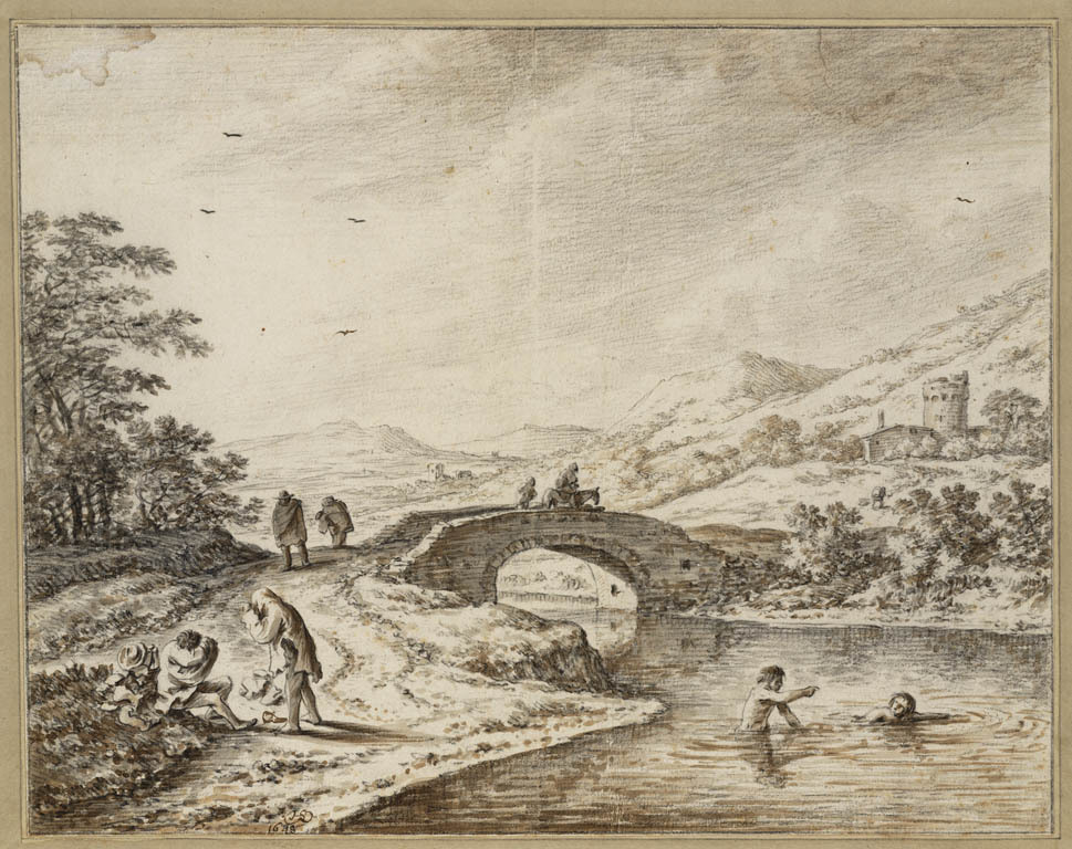 Heuvellandschap met rivier en baders