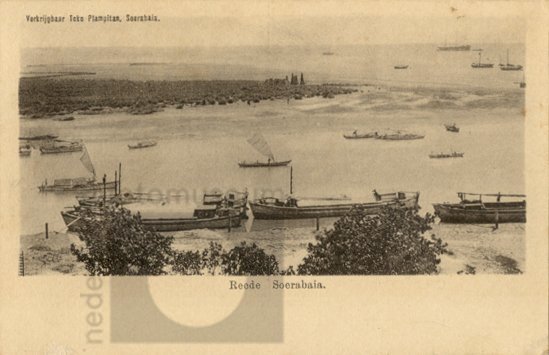 Zicht op de reede van Surabaya, met vaartuigen