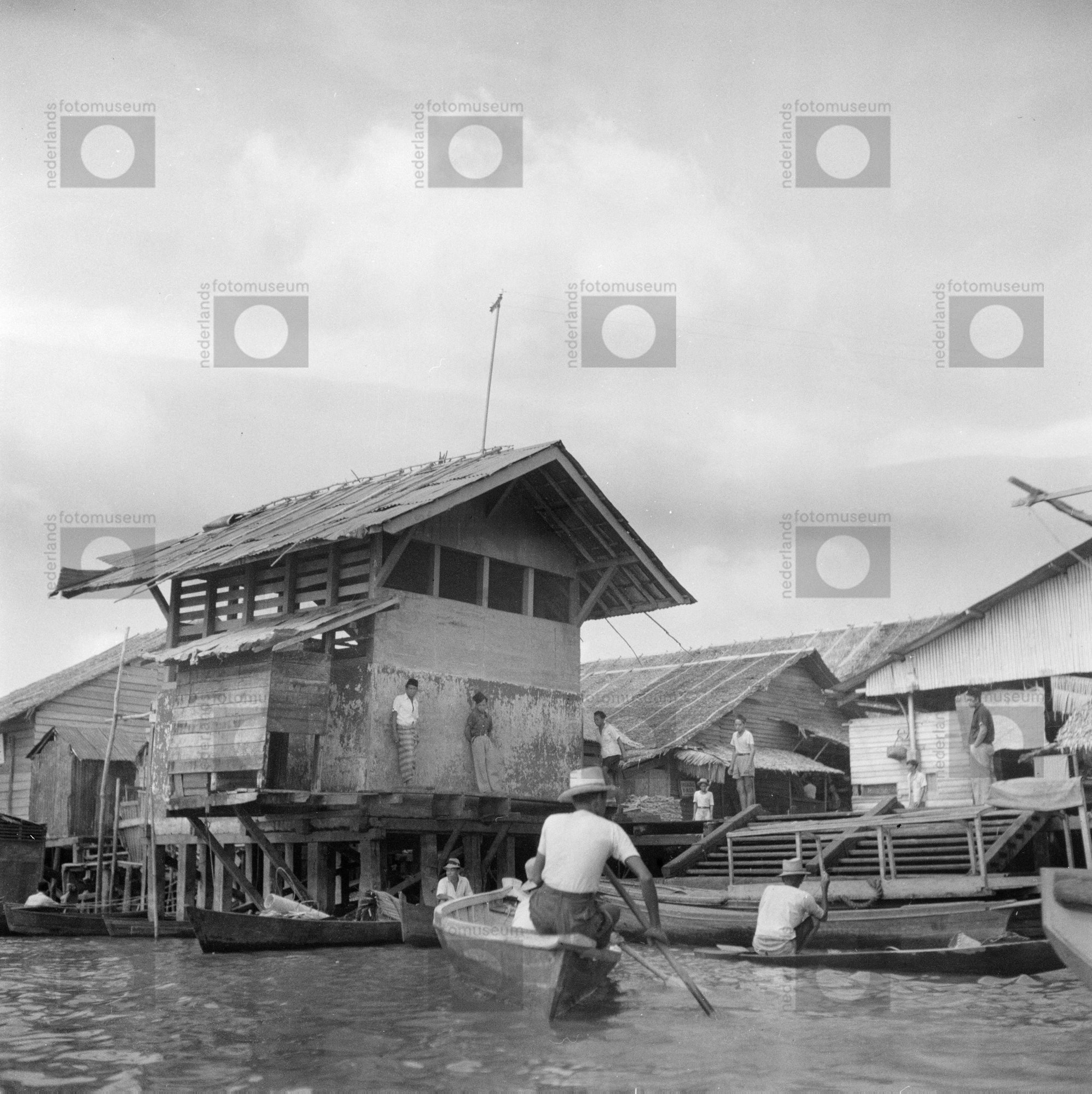 Bebouwing, deels op palen, langs haven van Pontianak...