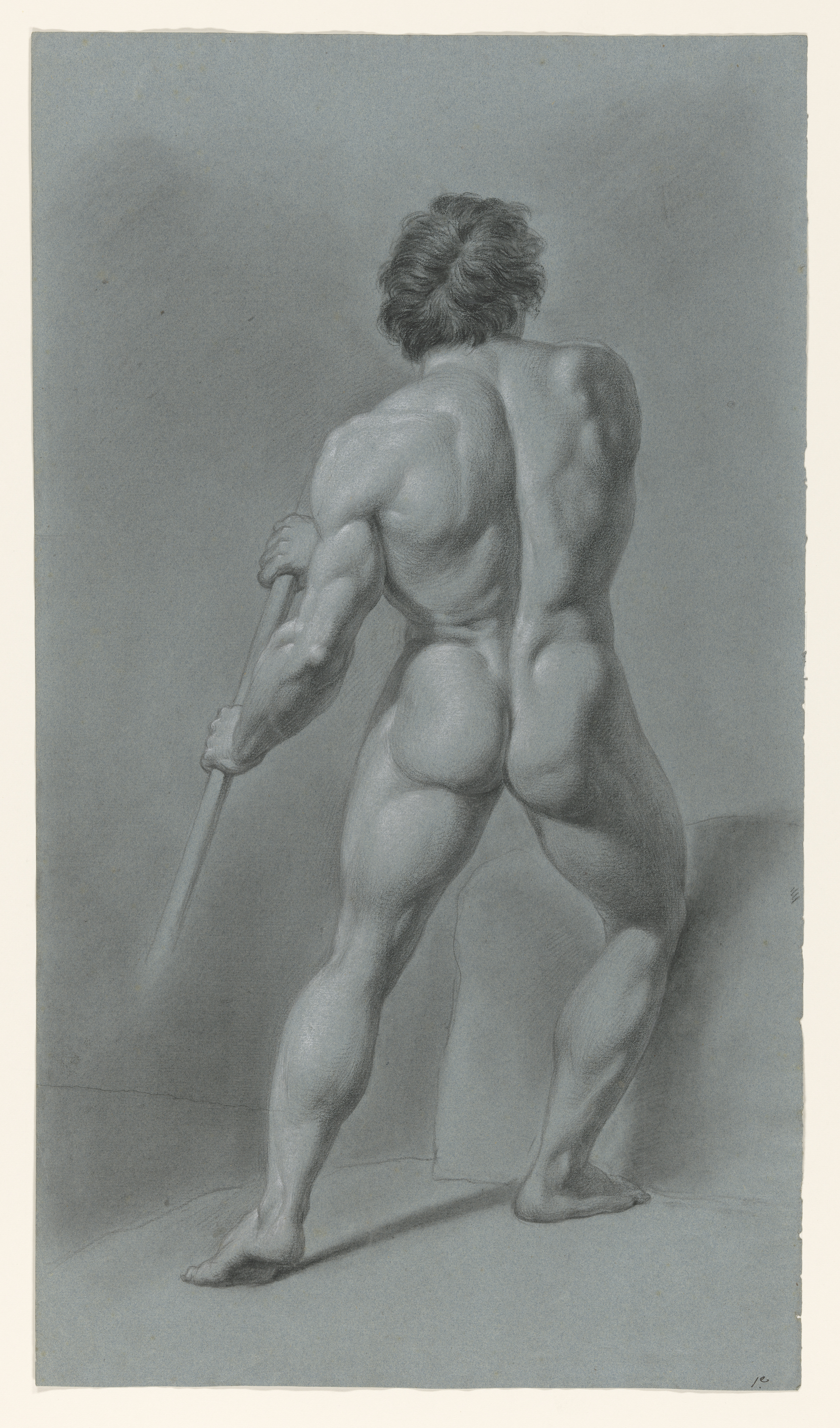Zittend mannelijk naakt, half naar links, op de rug ...