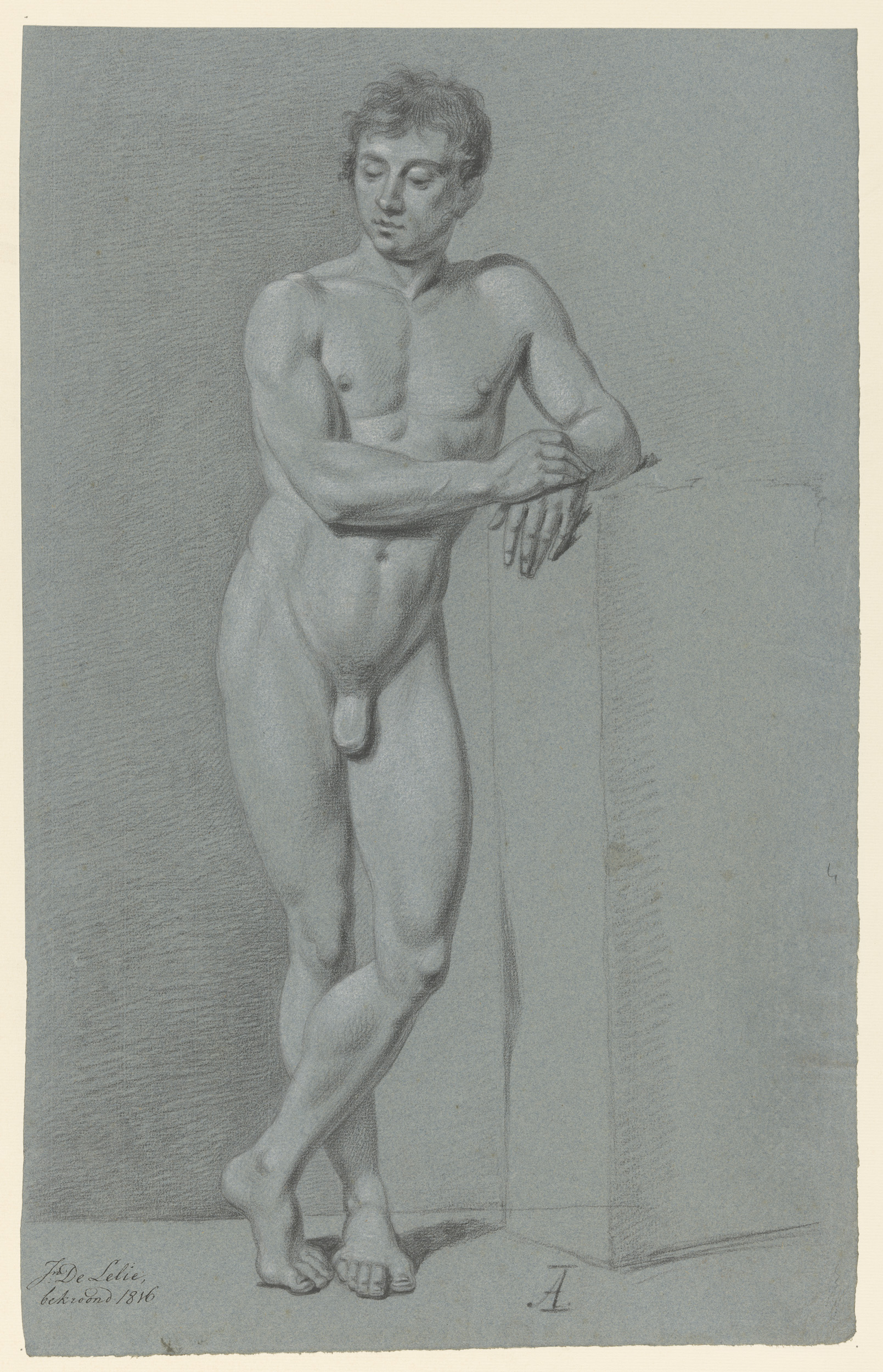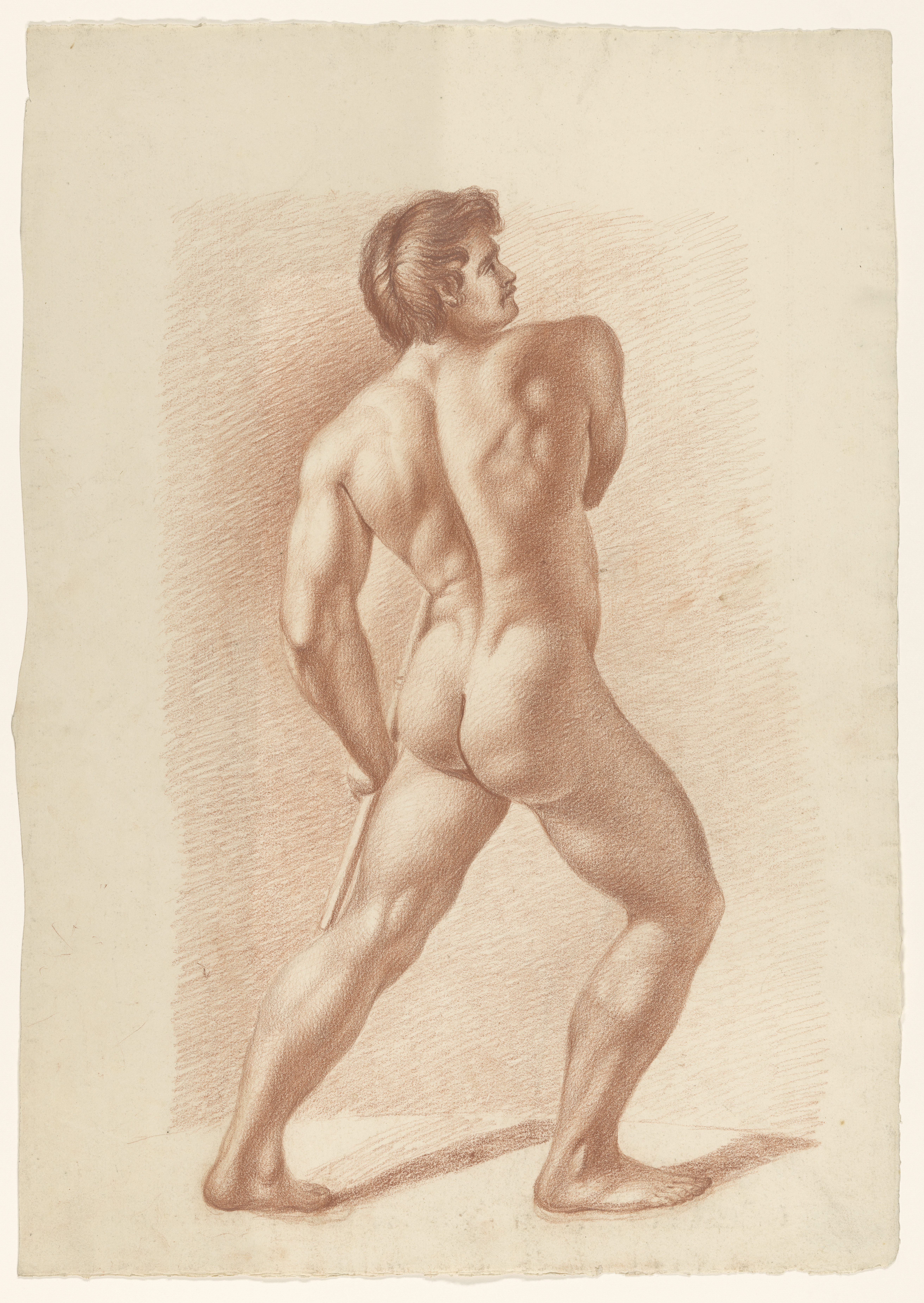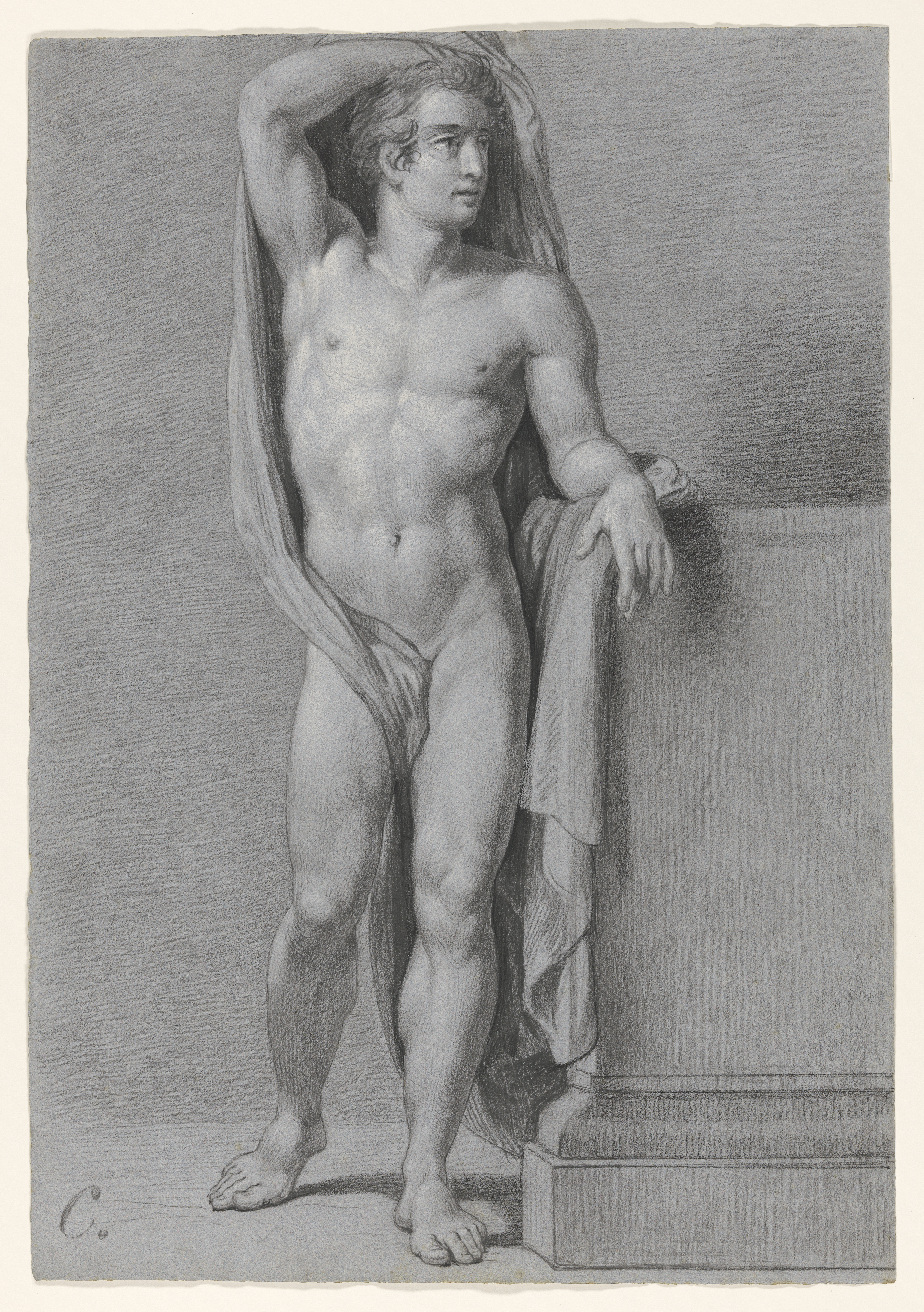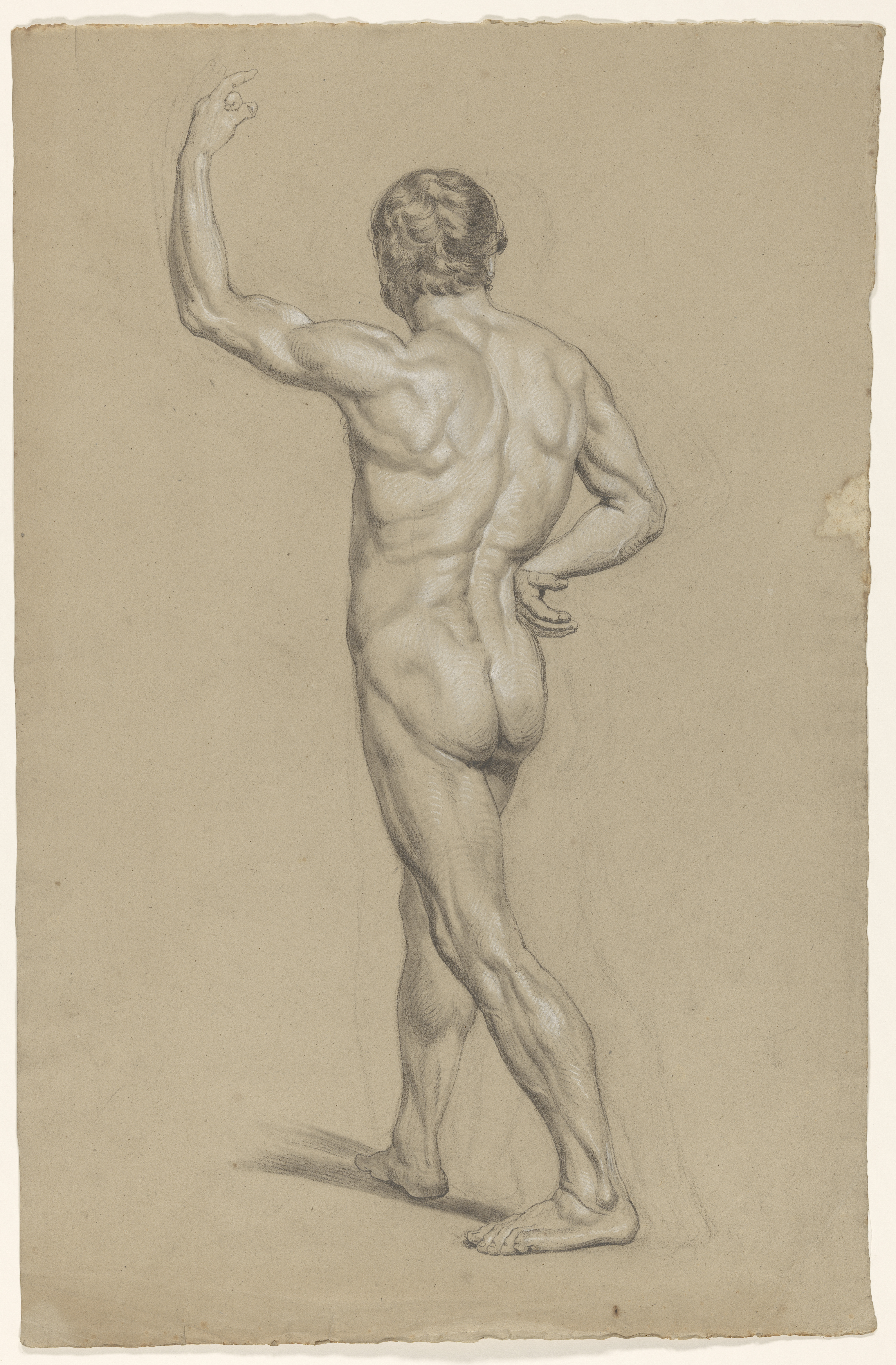 Staand mannelijk naakt met opgeheven arm, naar rechts