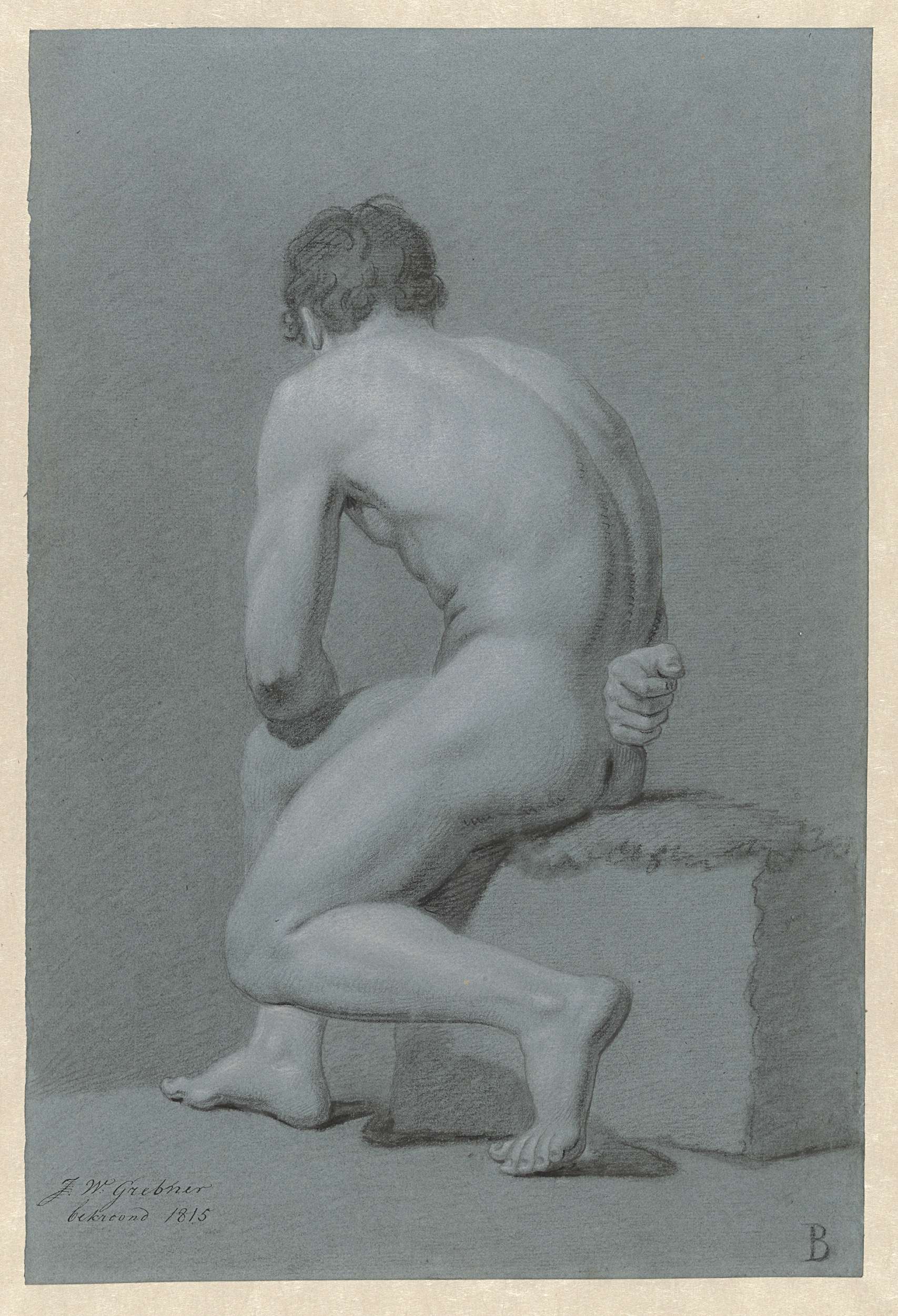 Zittend mannelijk naakt, op een blok, met gestrekt b...
