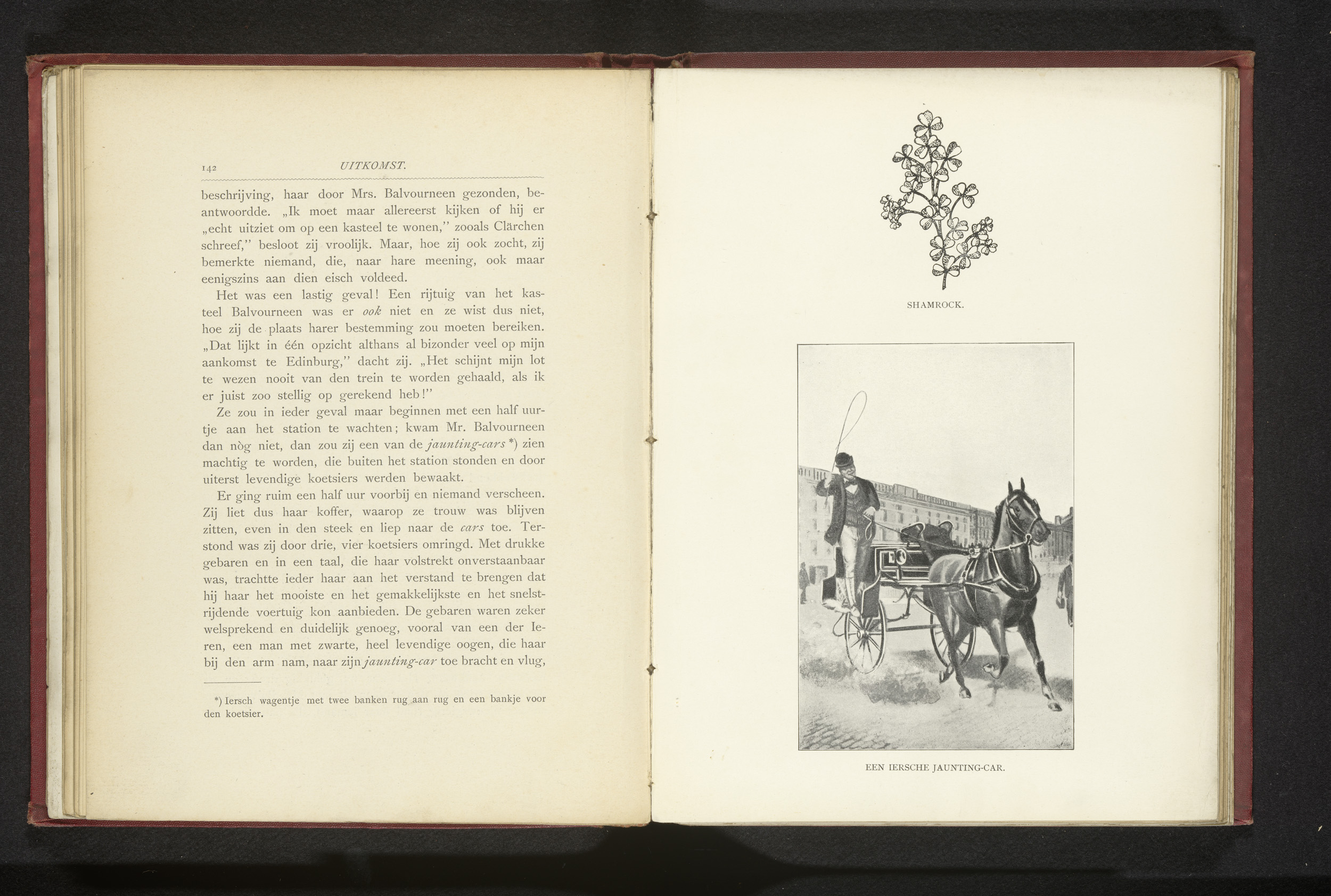 Reproductie van een prent van een man op een Ierse J...