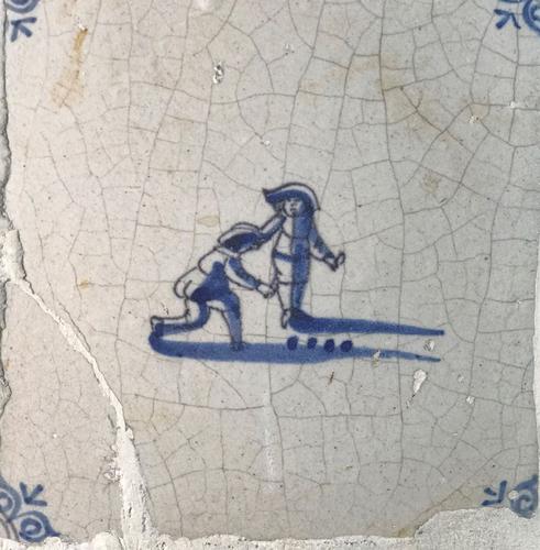 Tegel van aardewerk met tinglazuur voorstellende sch...