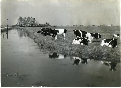 Foto in zwart-wit van koeien aan de slootkant door J...