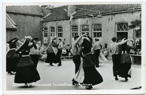 Prentbriefkaart in zwart-wit van volksdansen op Ters...