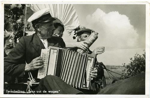 Prentbriefkaart van een accordeonspeler op Terschell...