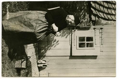 Prentbriefkaart in zwart-wit van een vrouw in kleder...