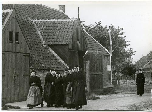 Prentbriefkaart in zwart-wit van vrouwen in Terschel...