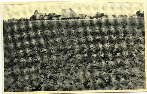 Prentbriefkaart in zwart-wit van twee boerderijen op...