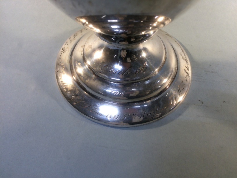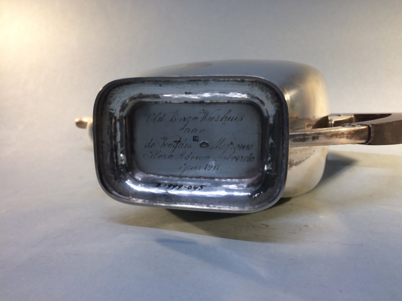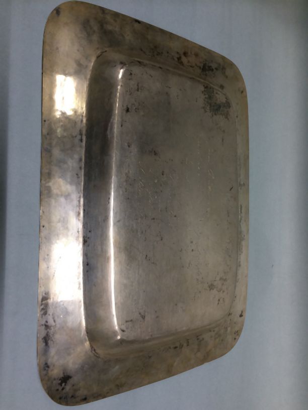 Zilveren dienblad met inscriptie aan de bovenzijde
