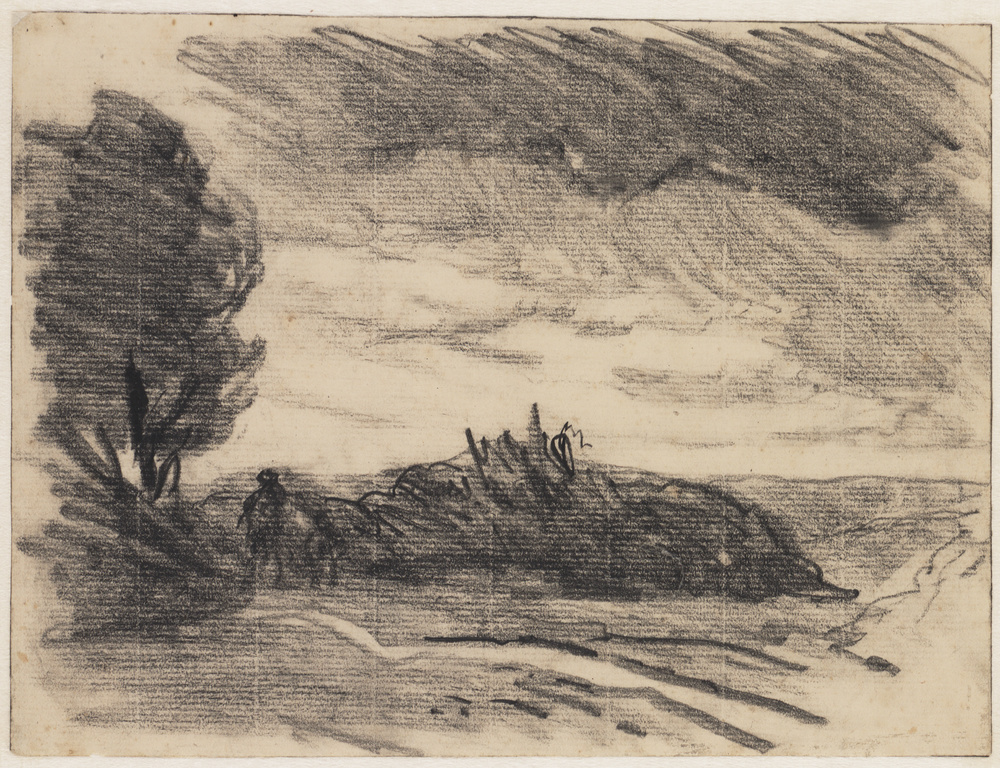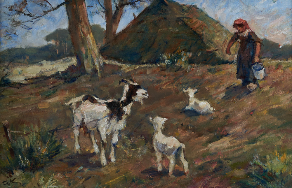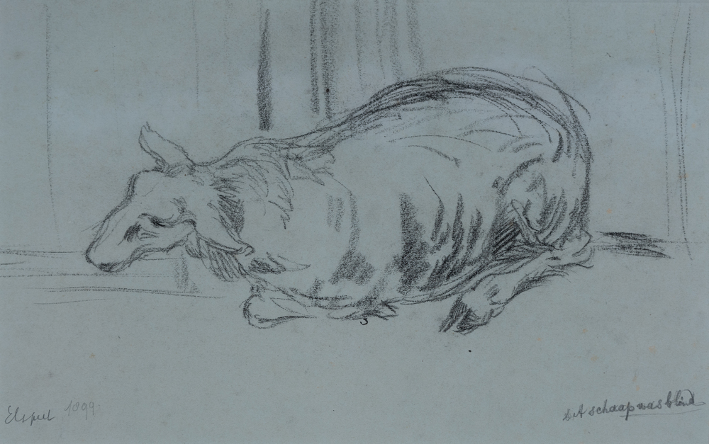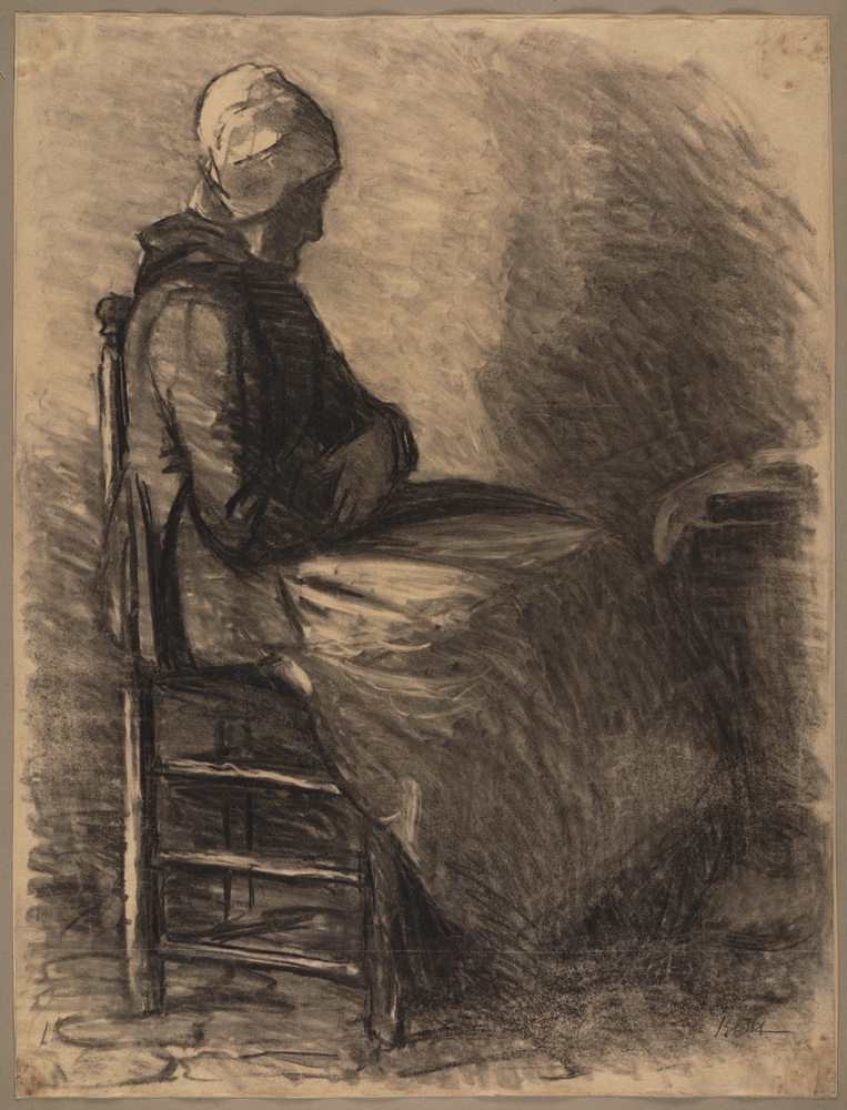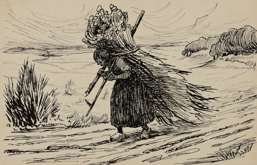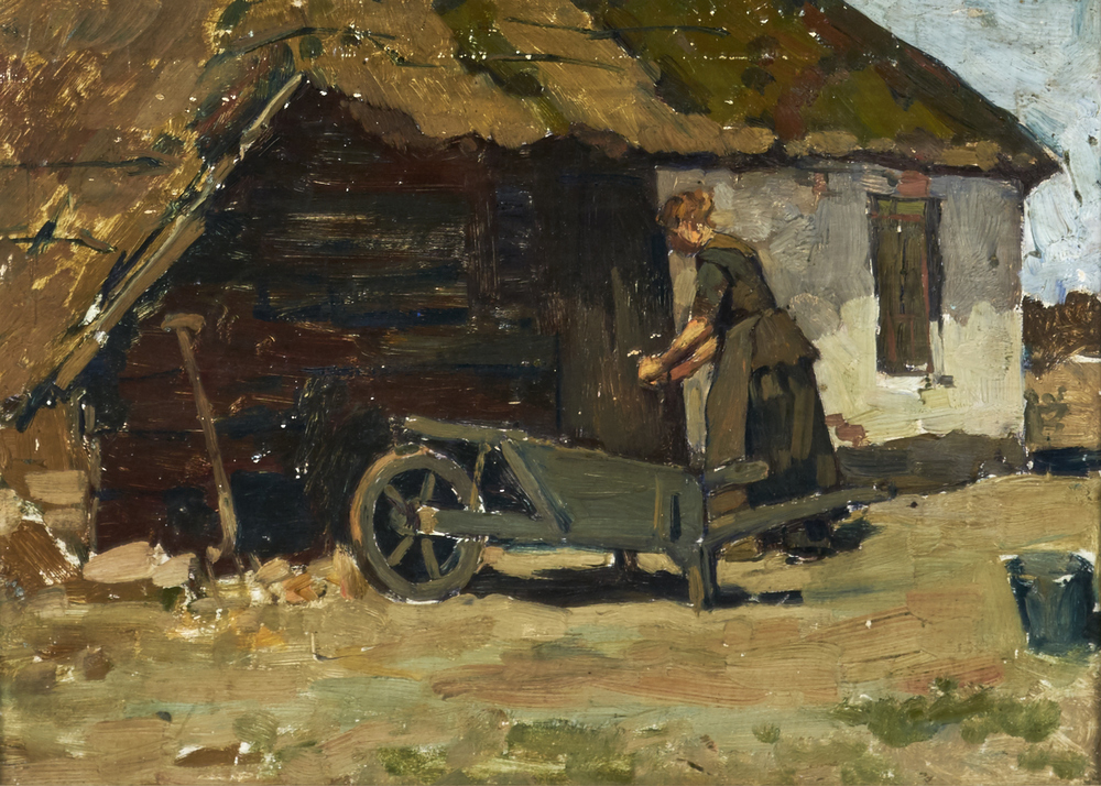 Boerderij met boerin en kruiwagen. 'Studie Nunspeet'.