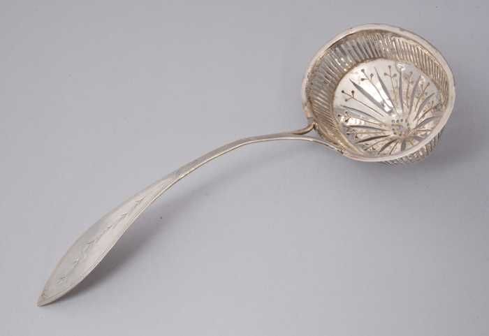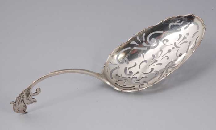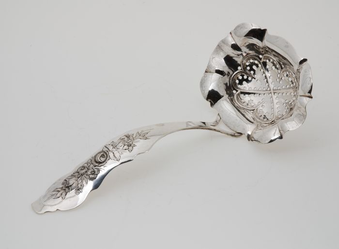 Zilveren strooilepel met ovale, opengewerkte bak