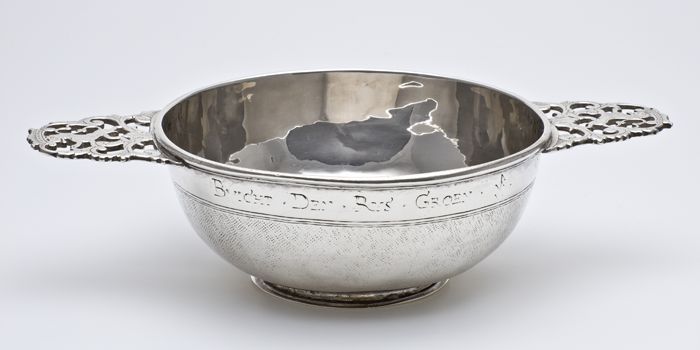 Zilveren brandewijnkom met "BVIGHT. DEN. RYS. GROEN."