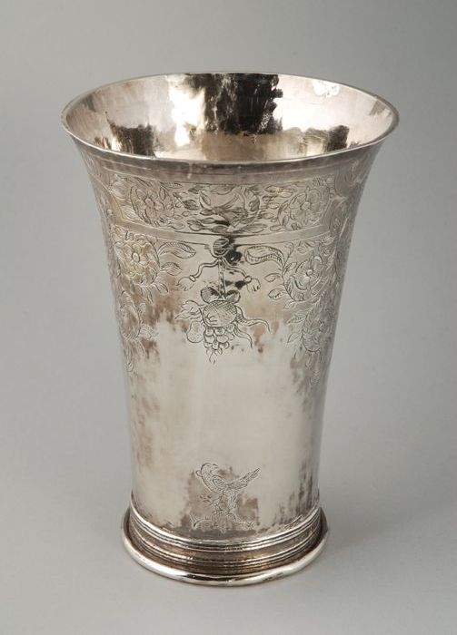 Zilveren beker, gegraveerd met bloem- en rankornamen...