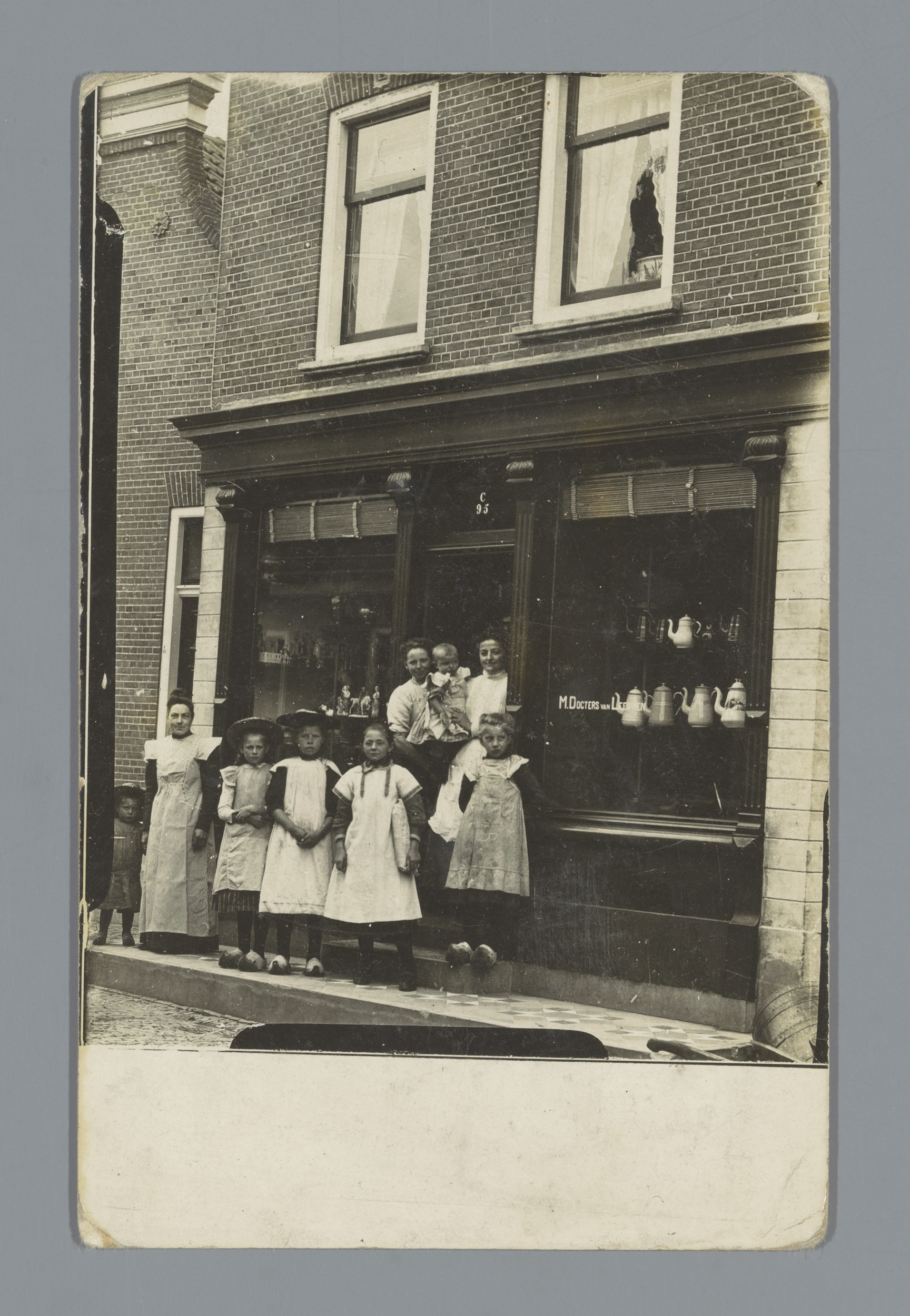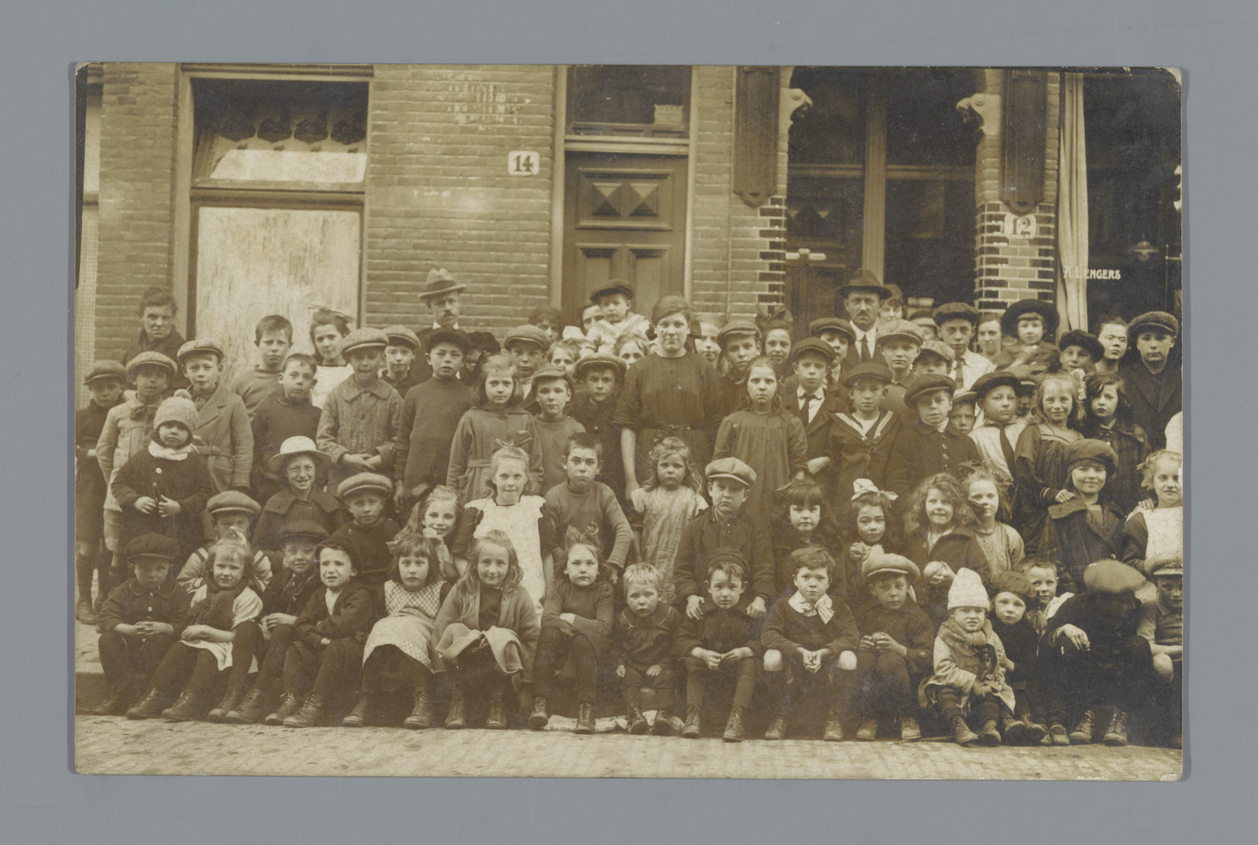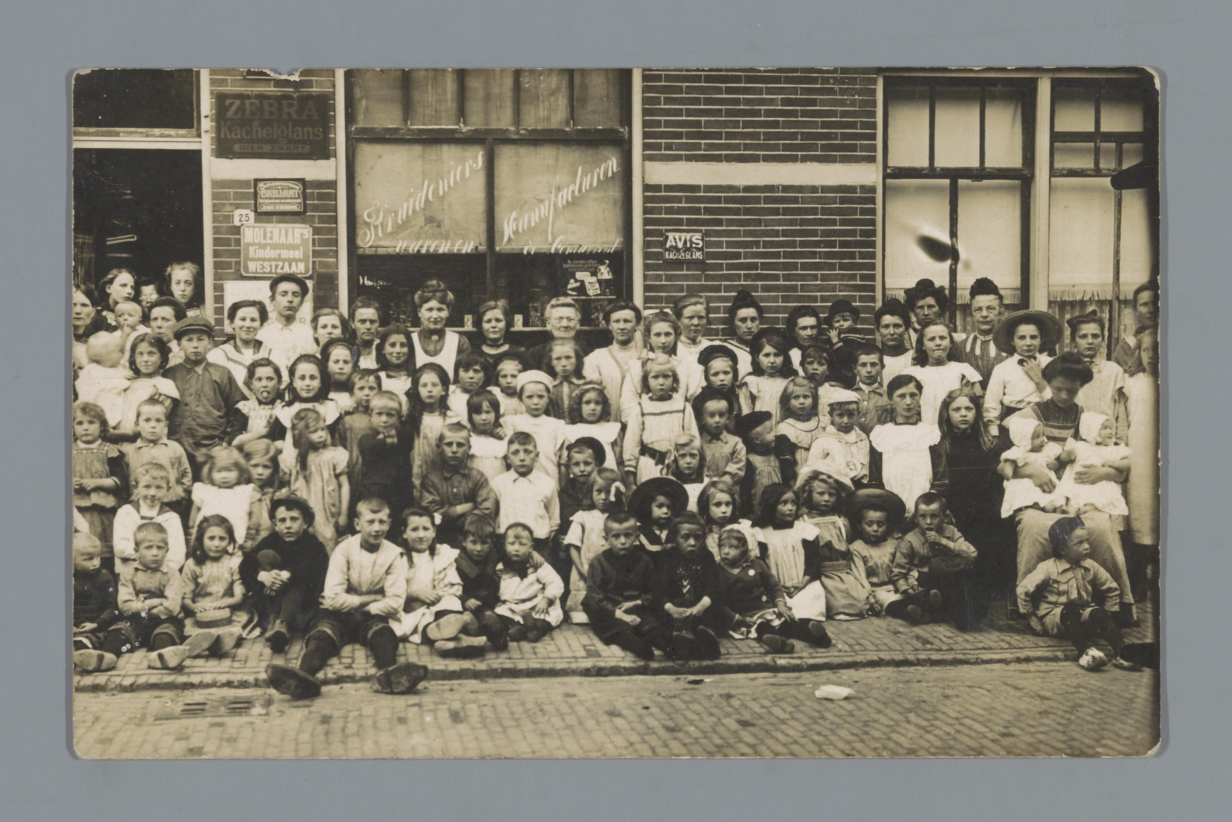 Groepsportret van kinderen voor een kruidenierswinkel