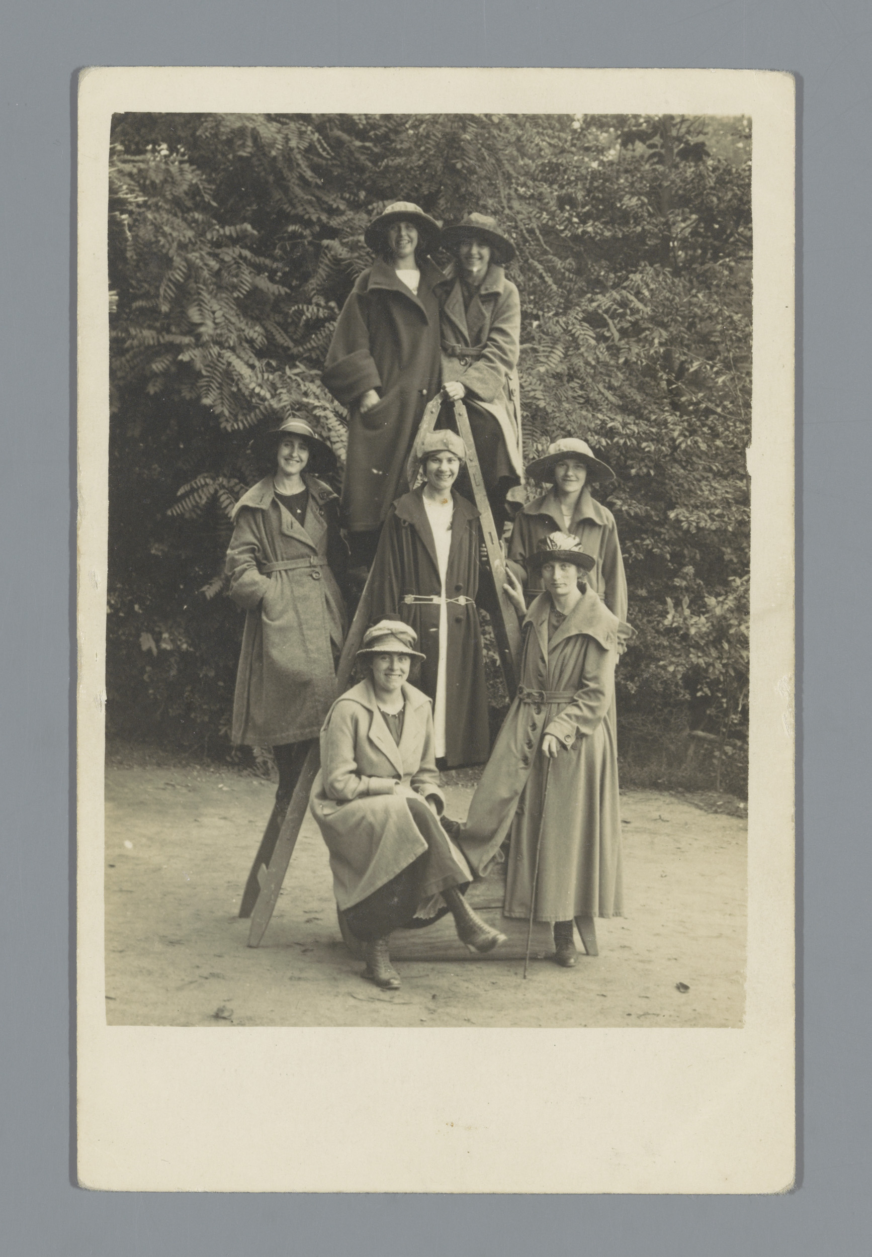 Groepsportret van negen onbekende vrouwen op een ladder