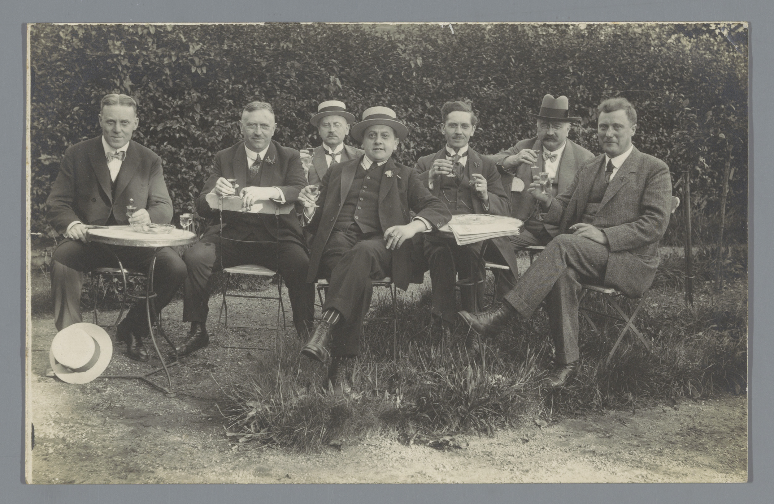 Groepsportret van zeven onbekende mannen op een grin...