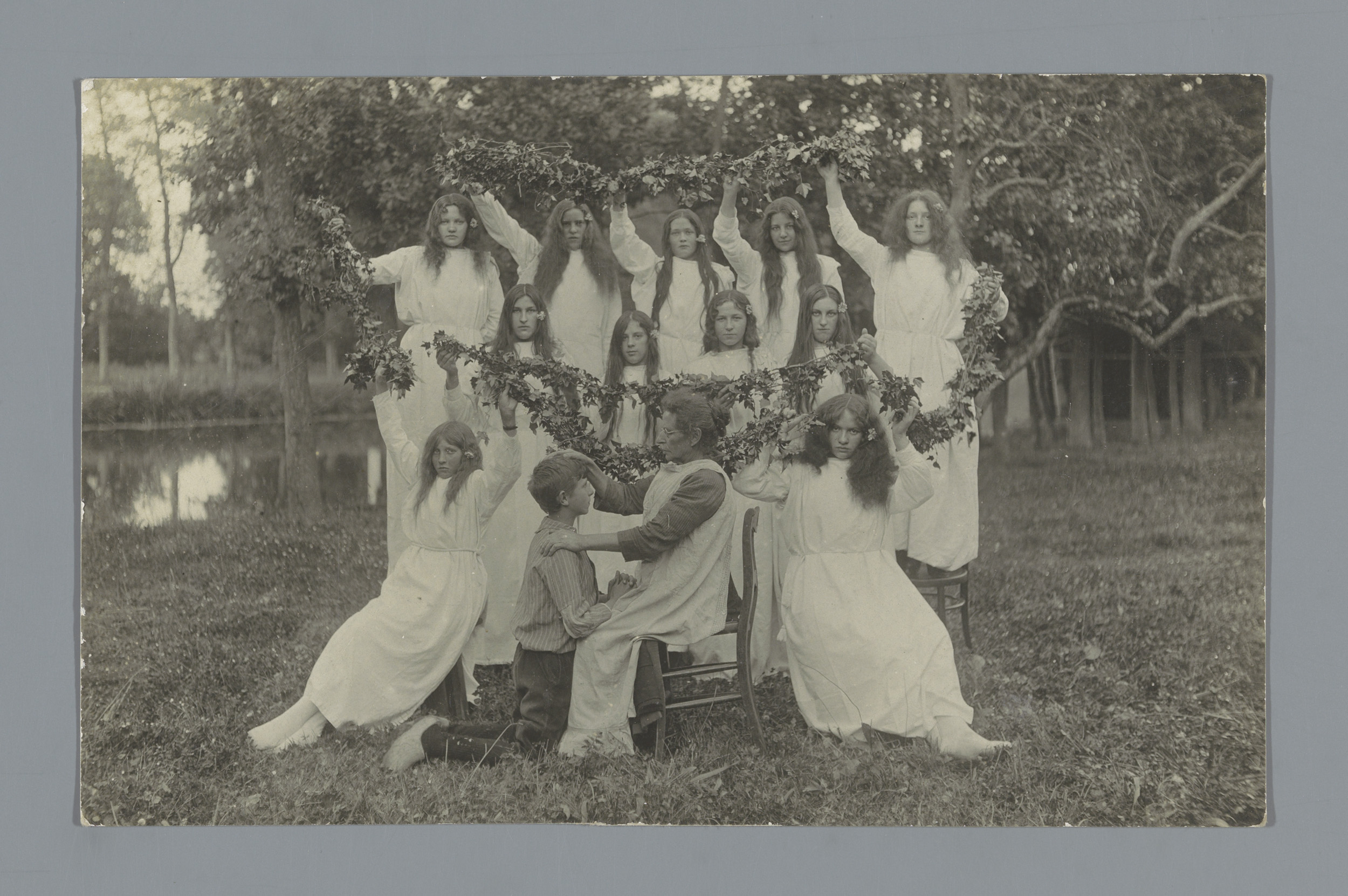 Groepsportret van jonge vrouwen in witte jurken rond...