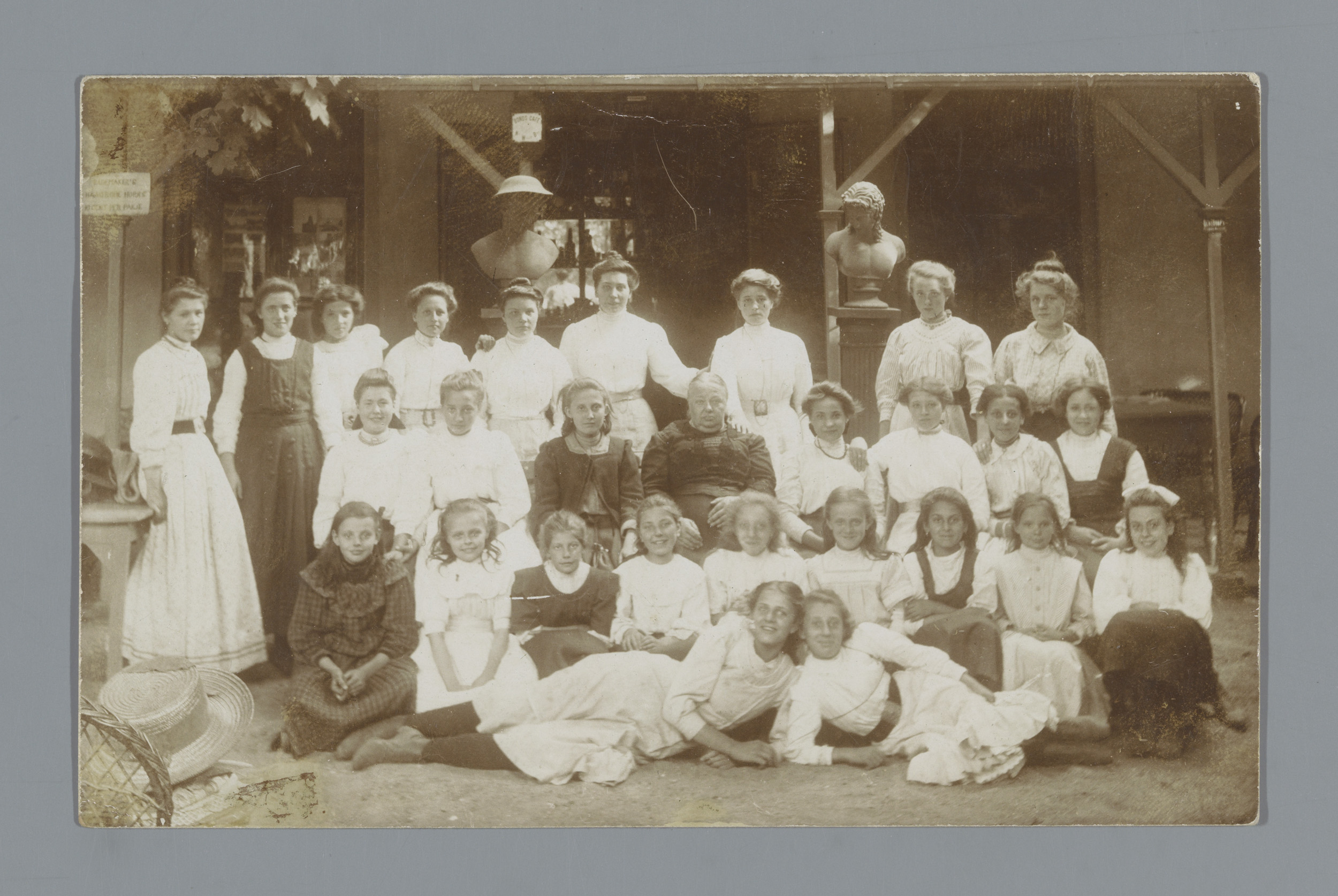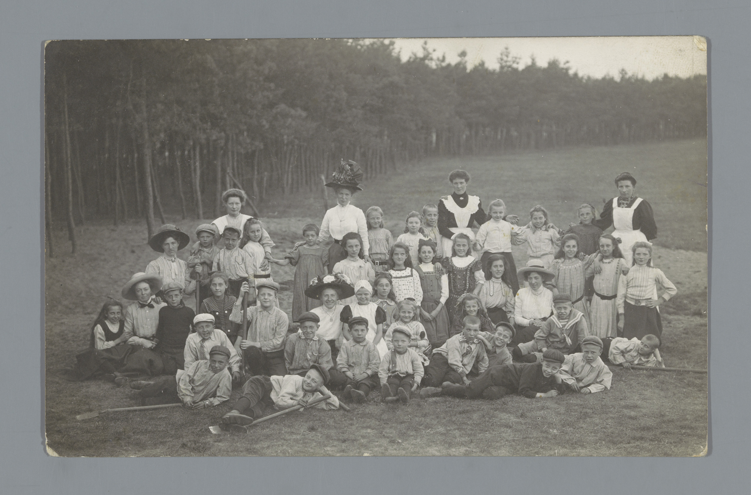 Groepsportret van kinderen en onbekende vrouwen op e...