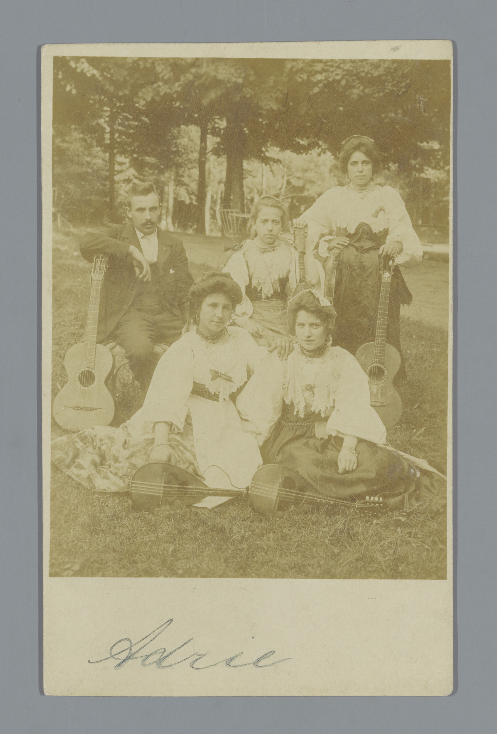 Groepsportret van leden van een muziekensemble met s...