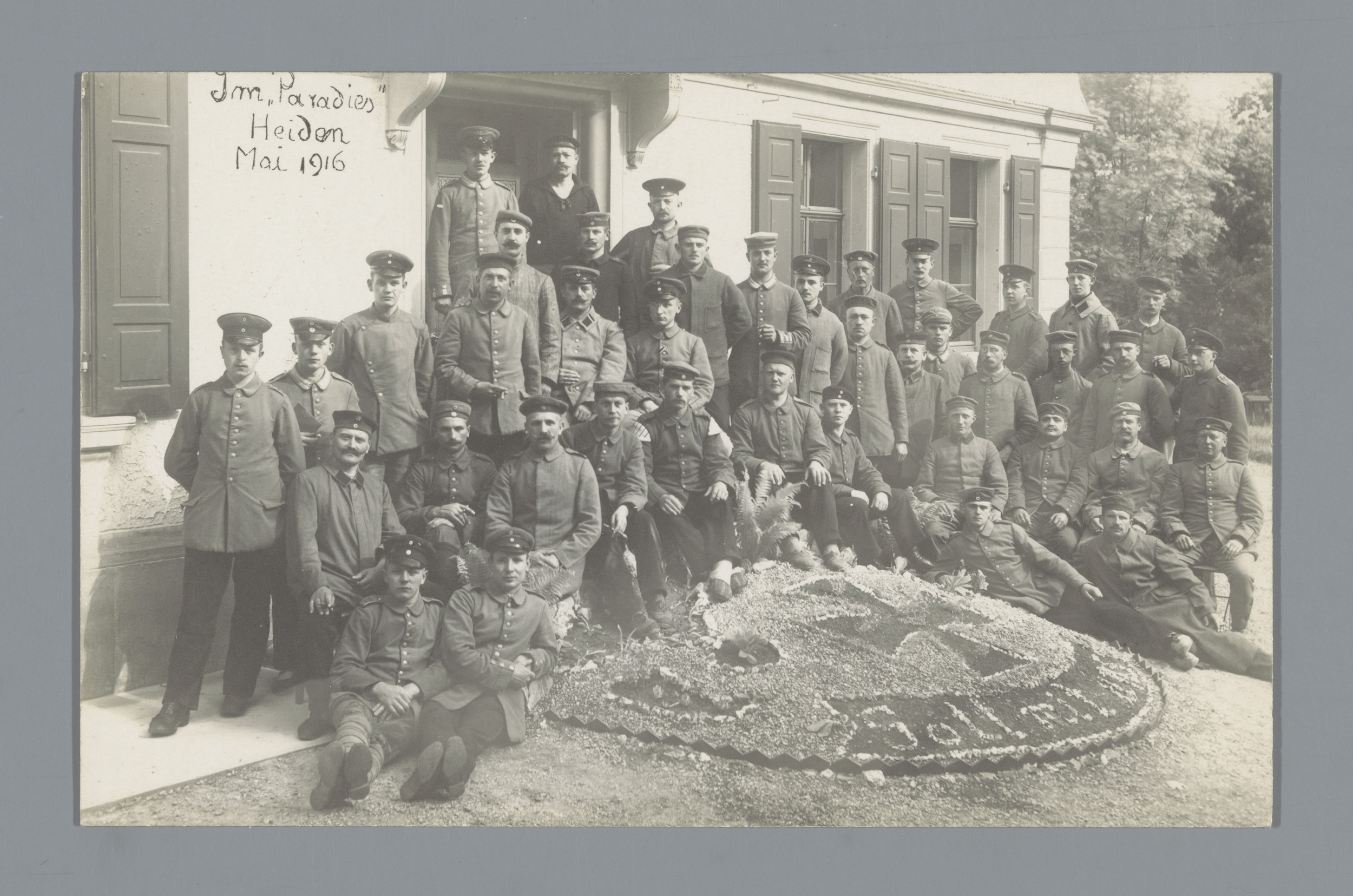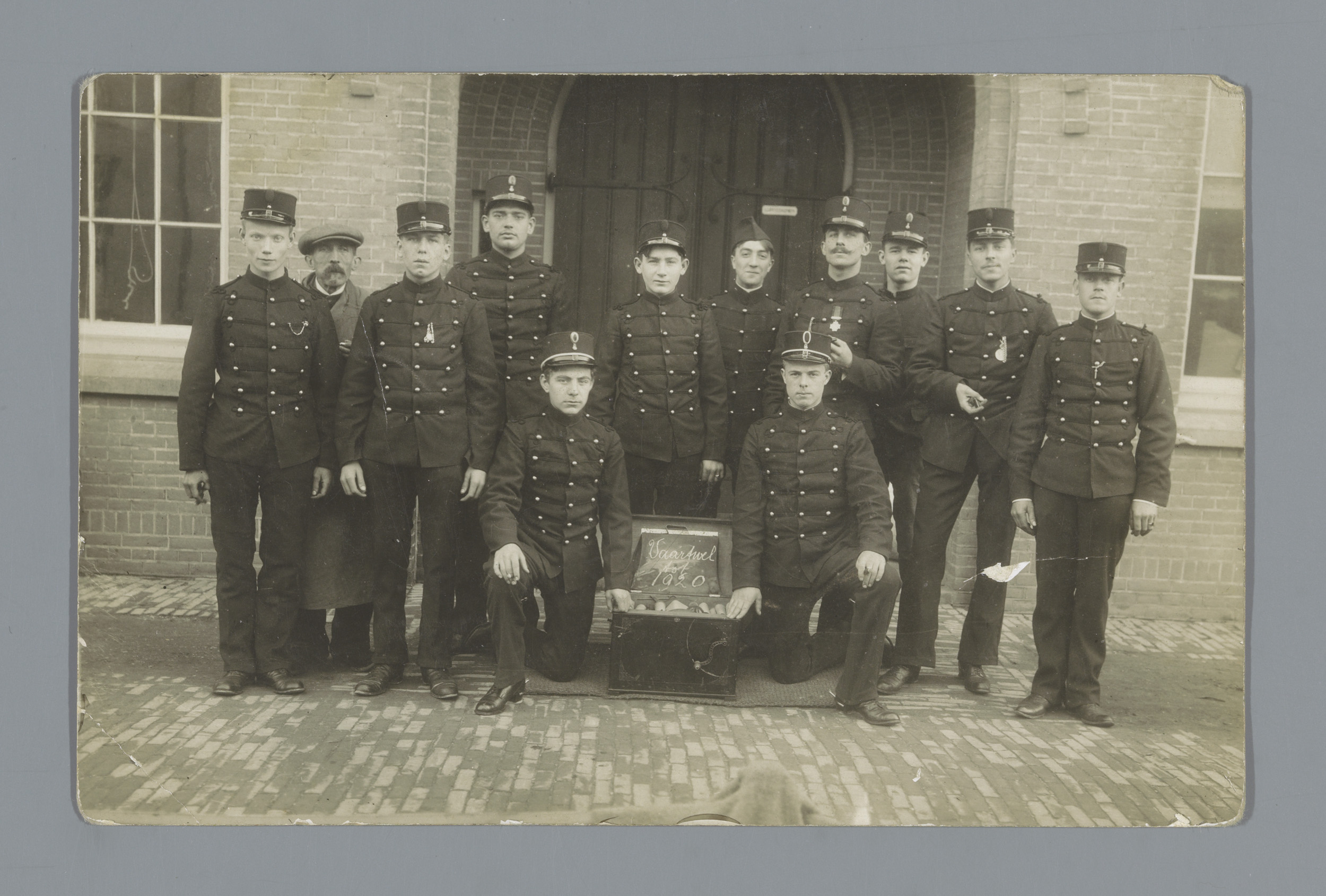 Groepsportret van soldaten in uniform voor een gebouw