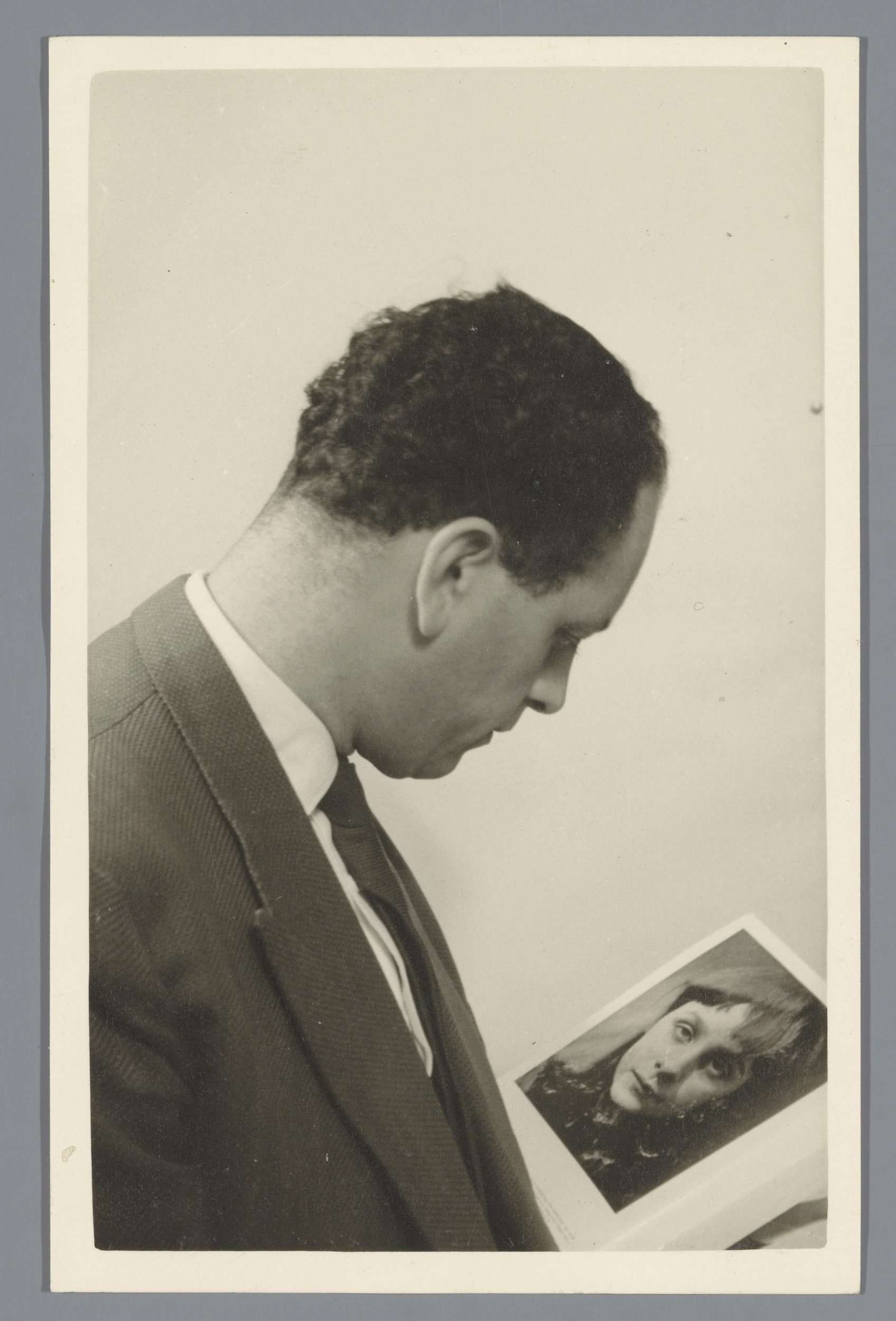 Onbekende man bekijkt een foto van een onbekende vro...