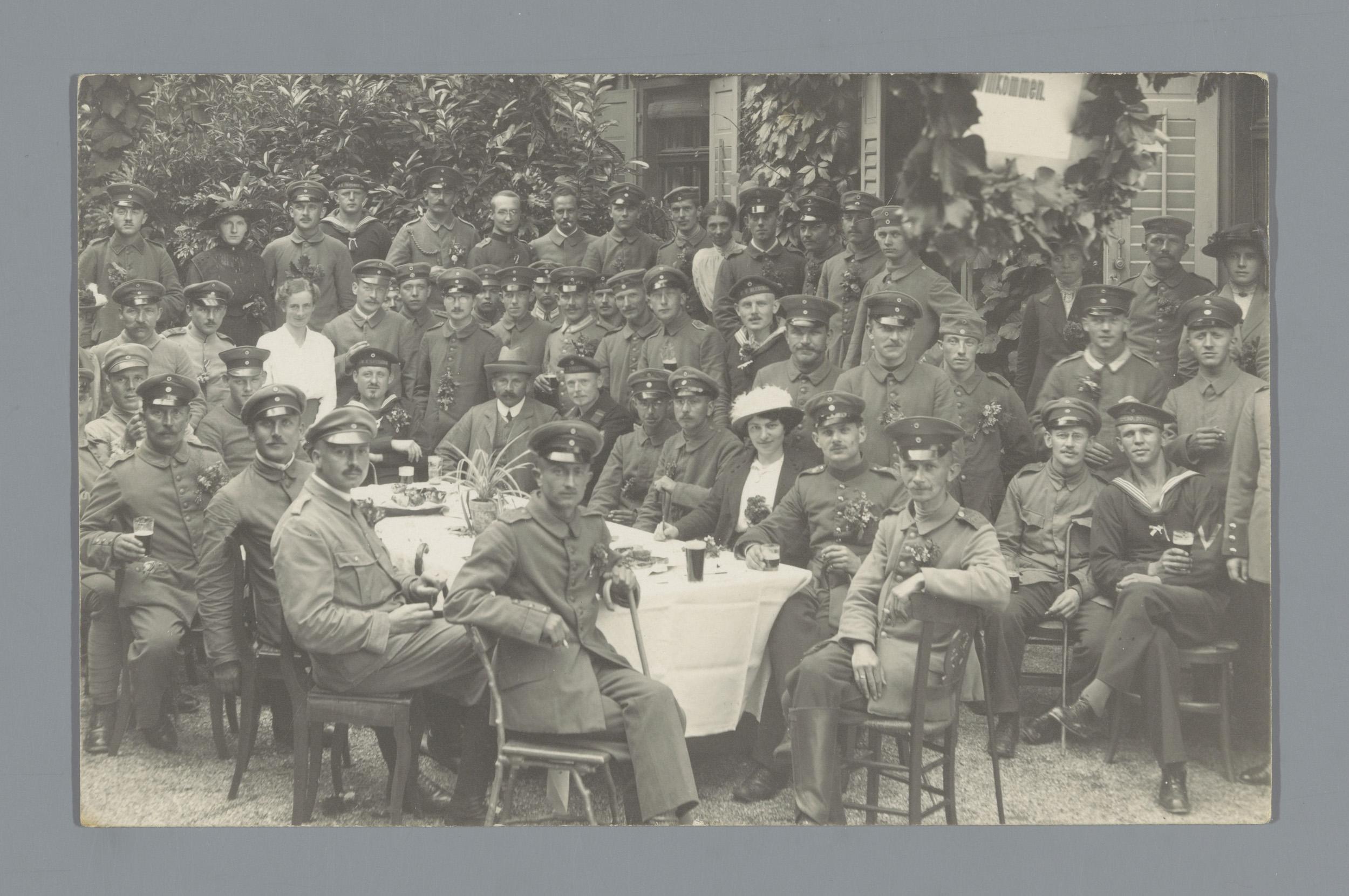 Groepsportret van militairen rond een bord met de te...