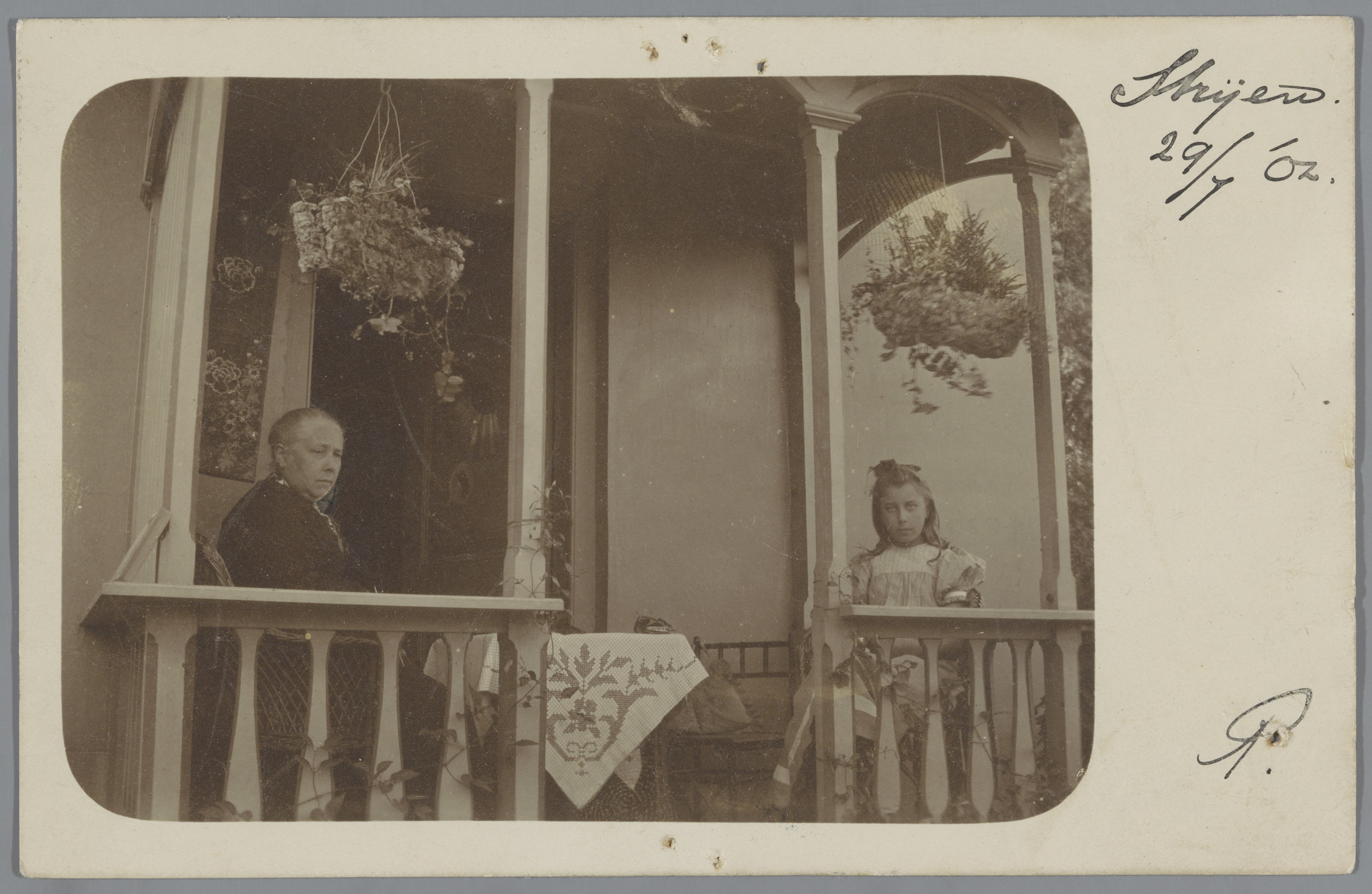 Portret van een oude vrouw en een meisje op een vera...
