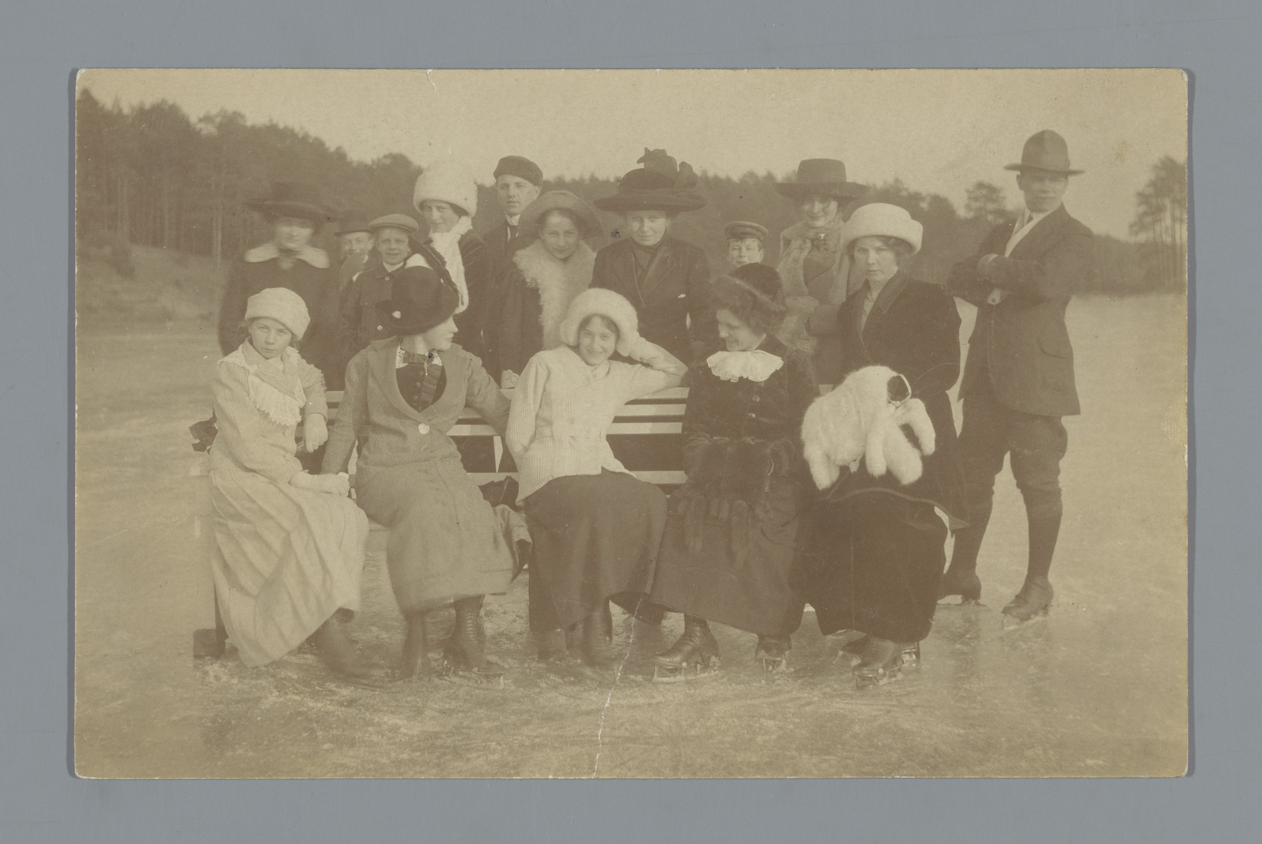 Groepsportret van een onbekend gezelschap op schaats...