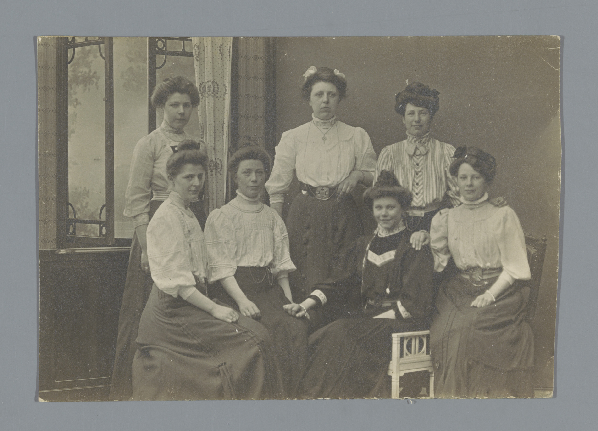 Groepsportret van zeven onbekende vrouwen in een int...