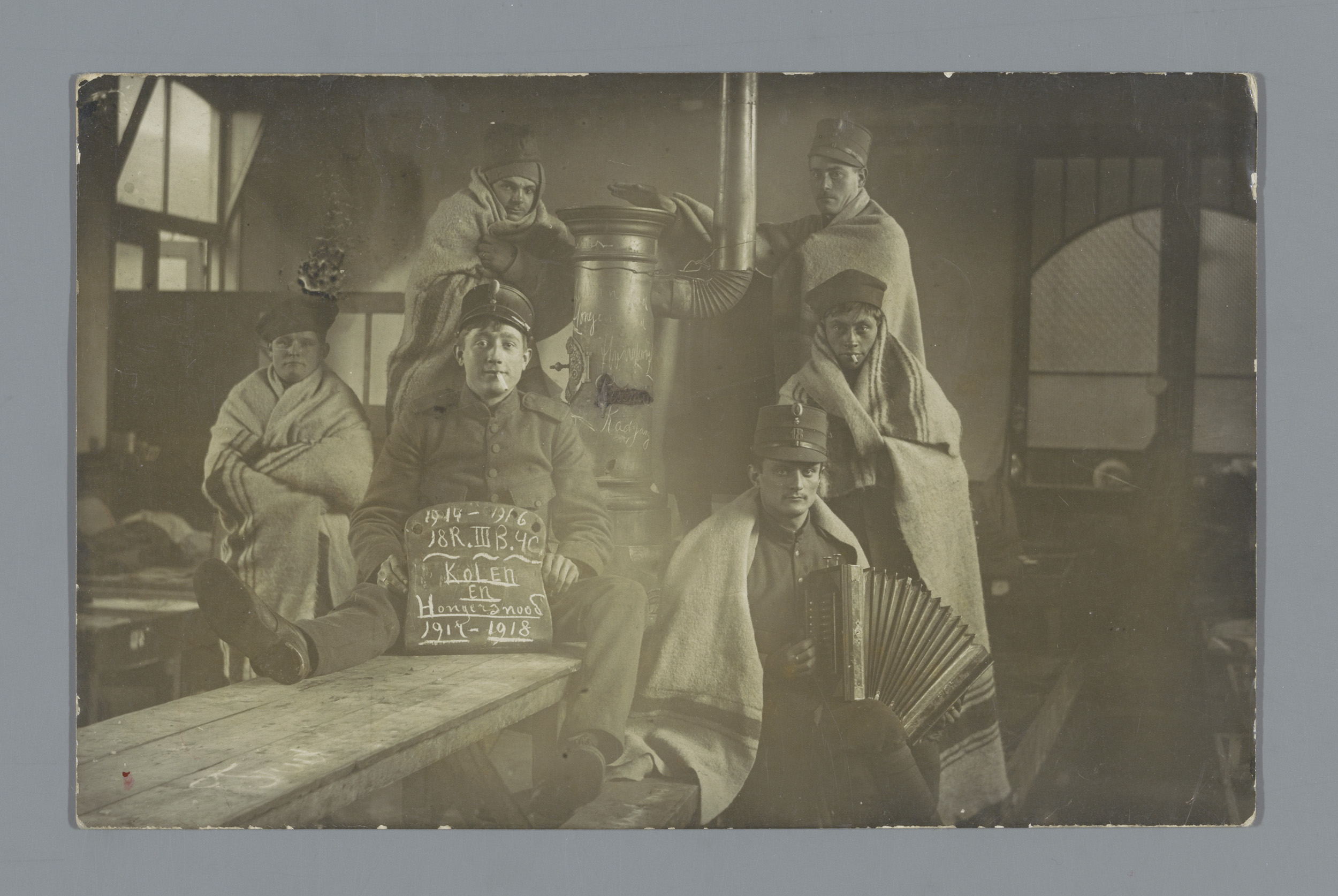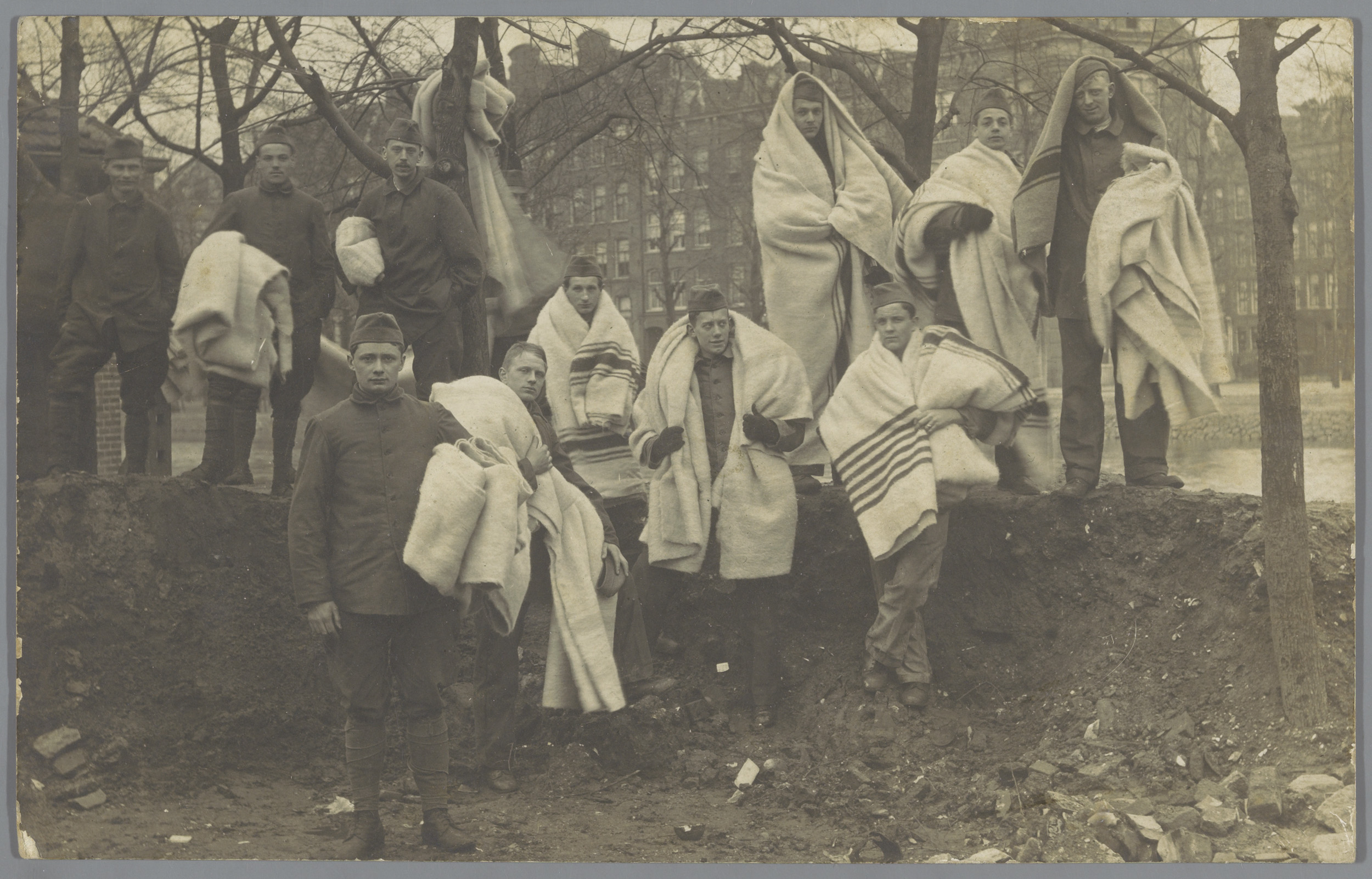 Groepsportret van soldaten met dekens