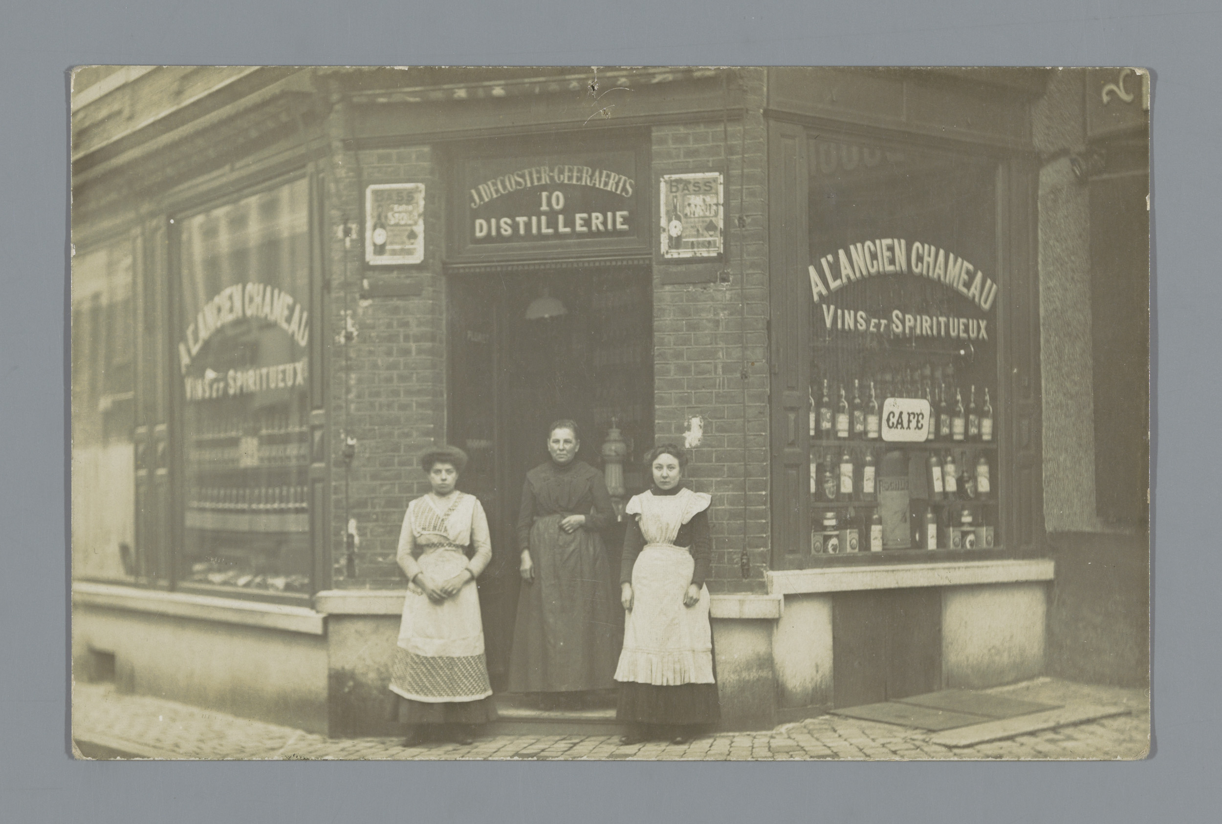 Portret van drie onbekende vrouwen voor het café A l...