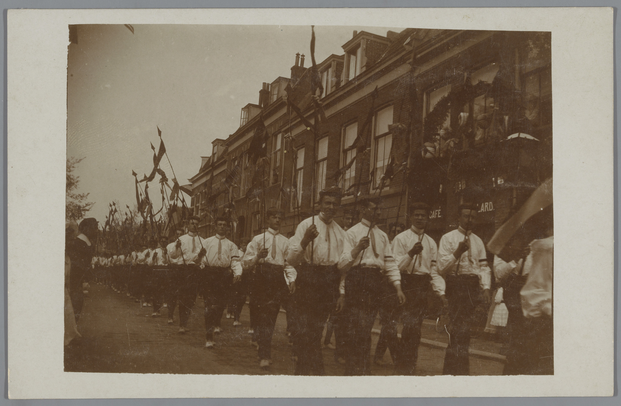 Gezicht op een processie op straat