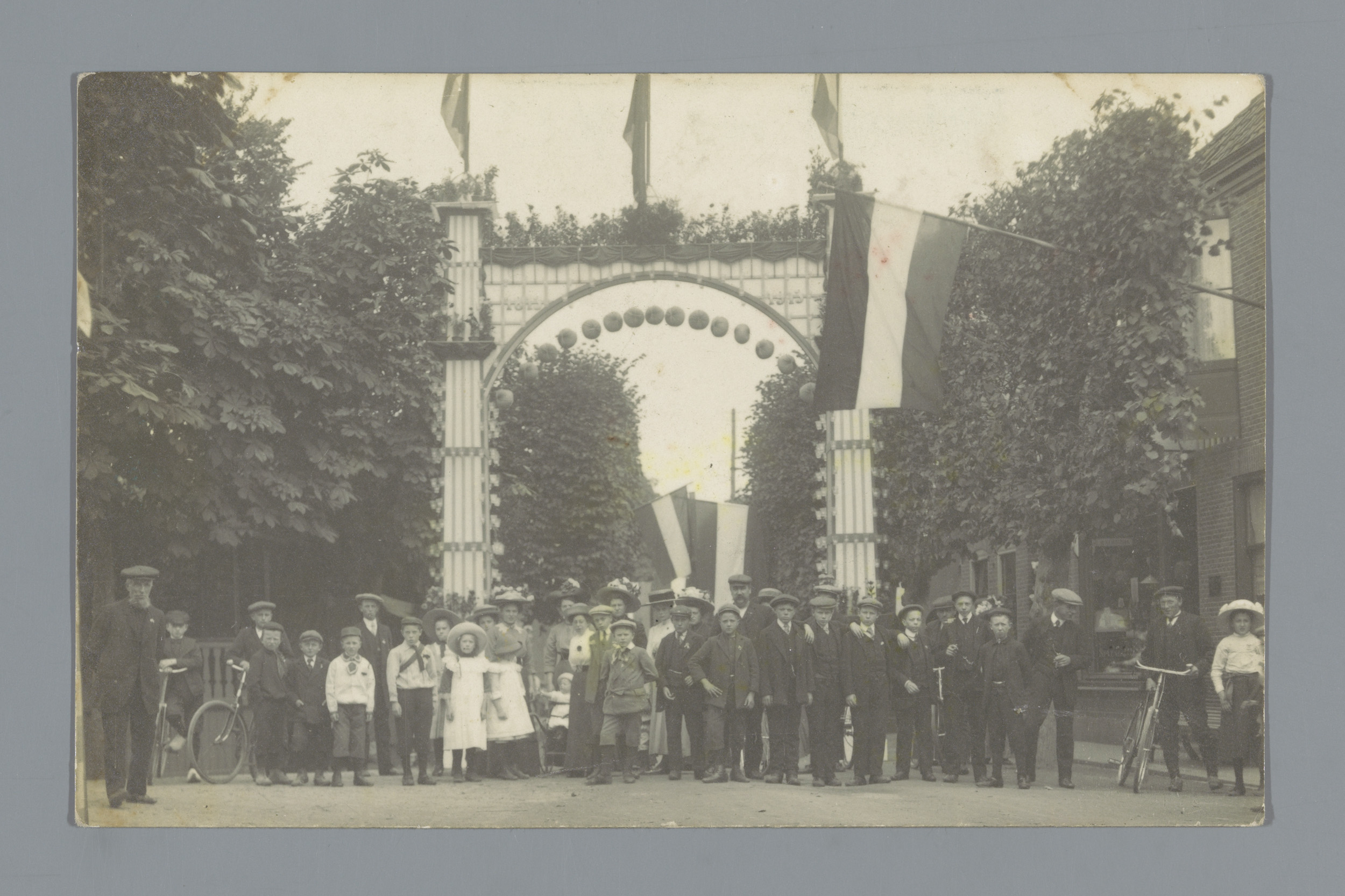 Groepsportret van onbekende mensen in een straat met...