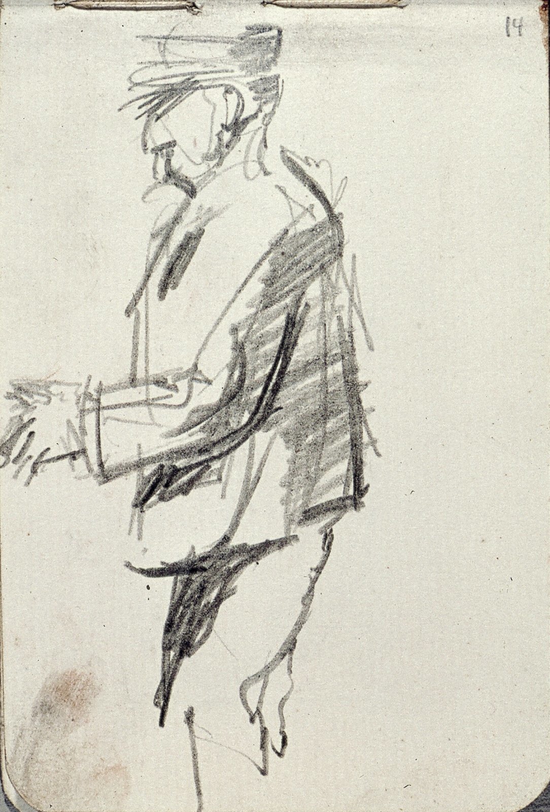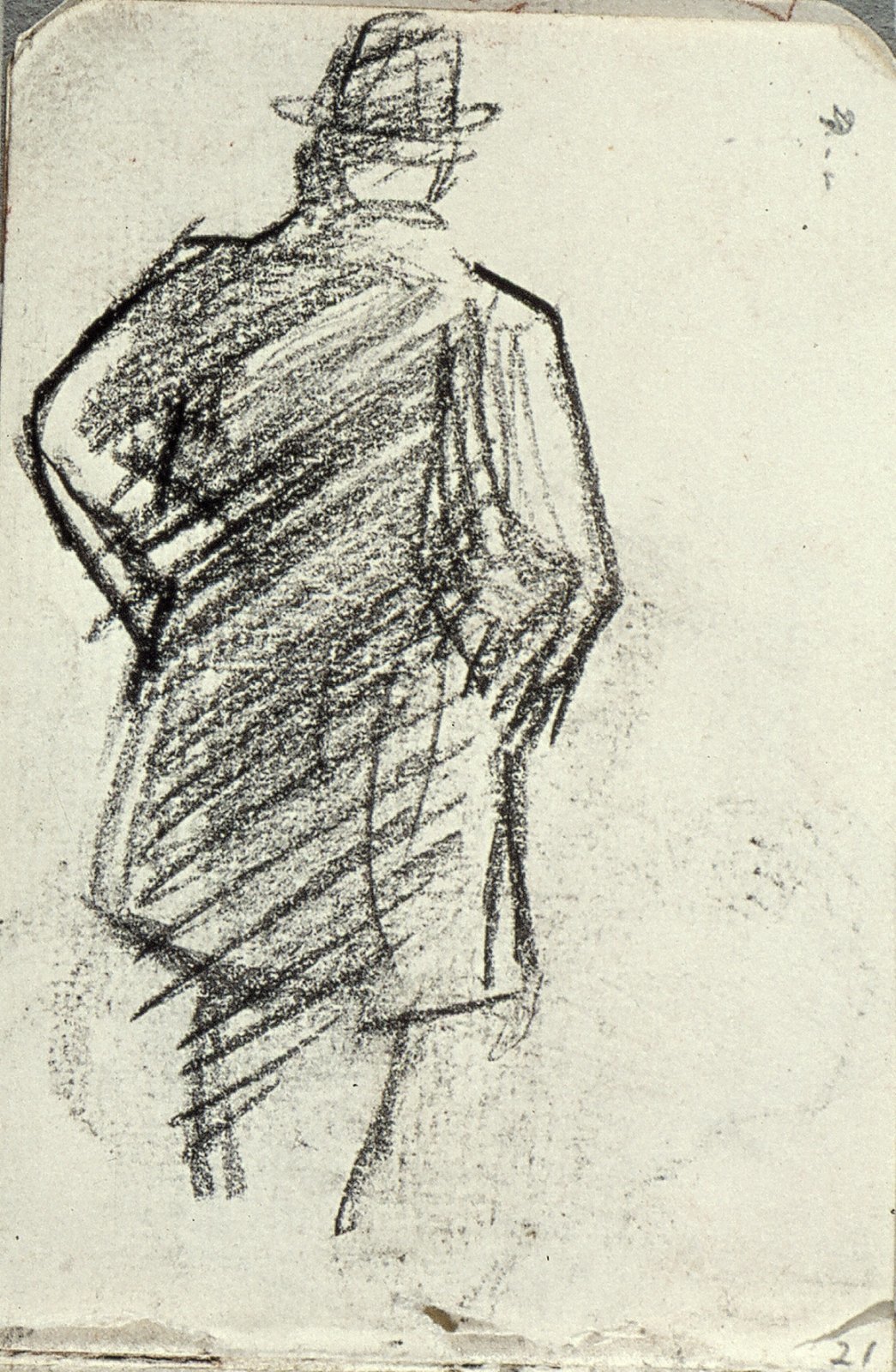Staande man met hoed, op de rug gezien