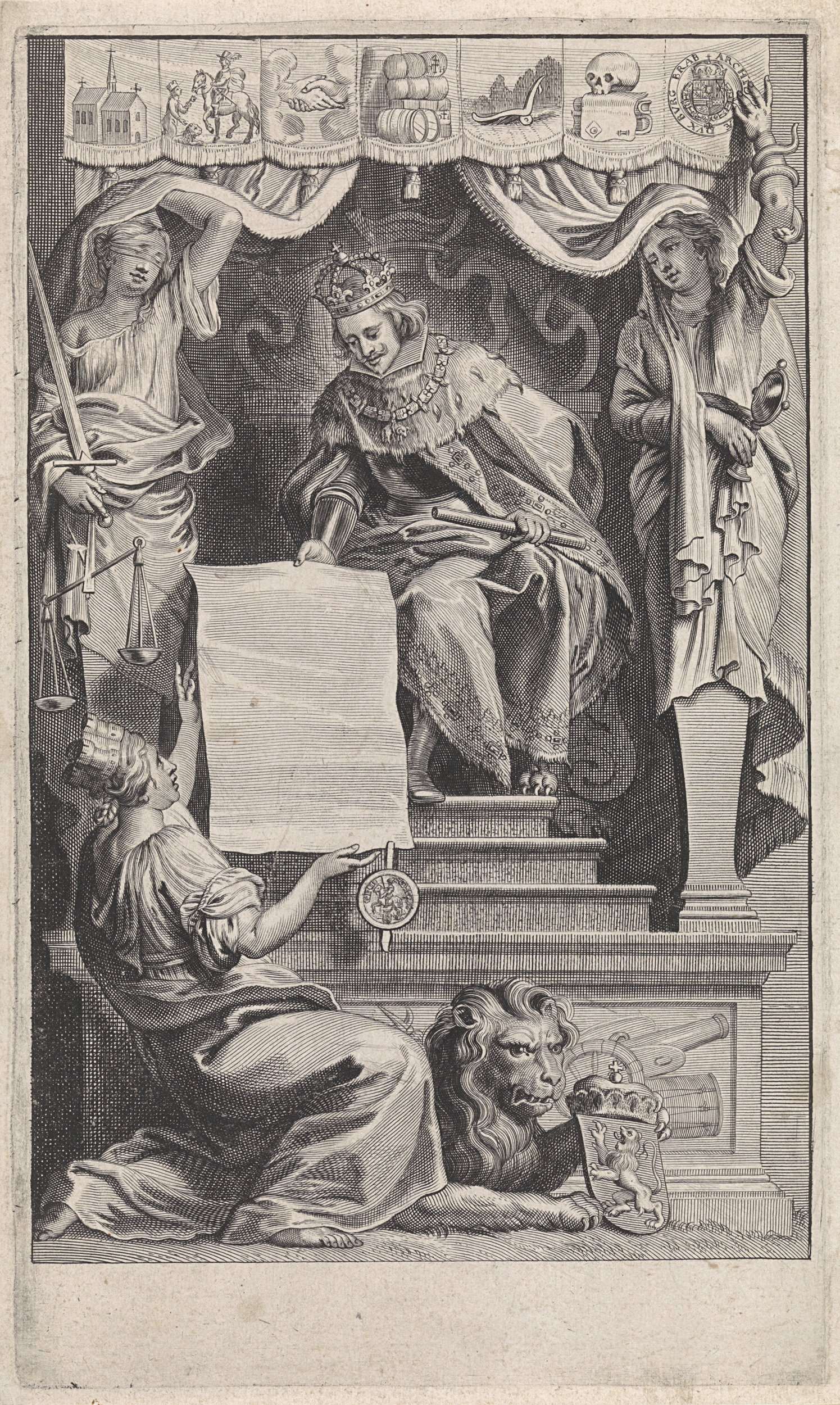 Allegorische titelprent met de Nederlandse Maagd gef...