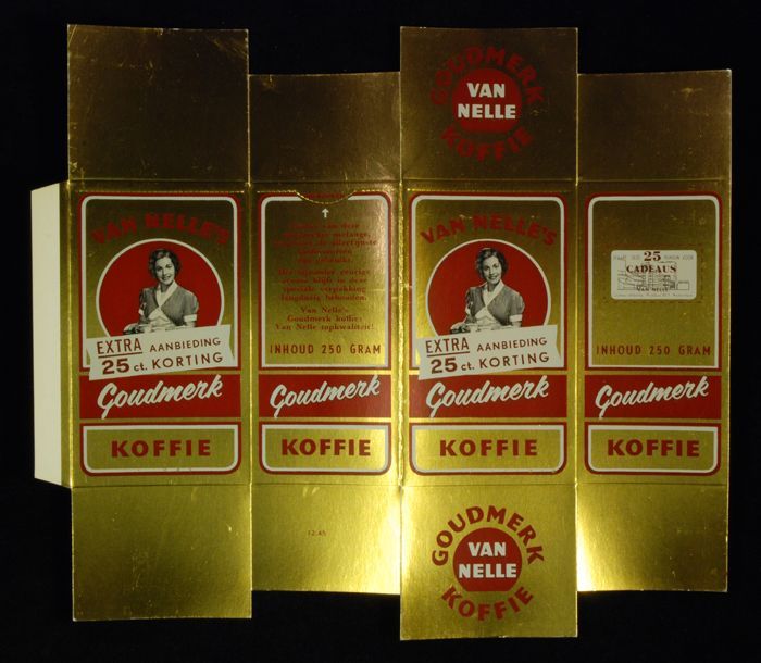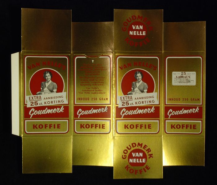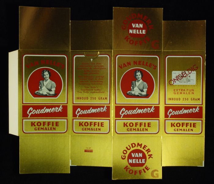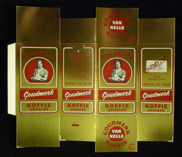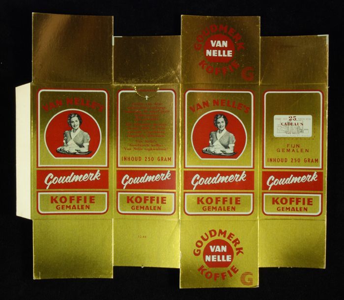 Goudkleurig, kartonnen pak VAN NELLE'S GOUDMERK KOFF...