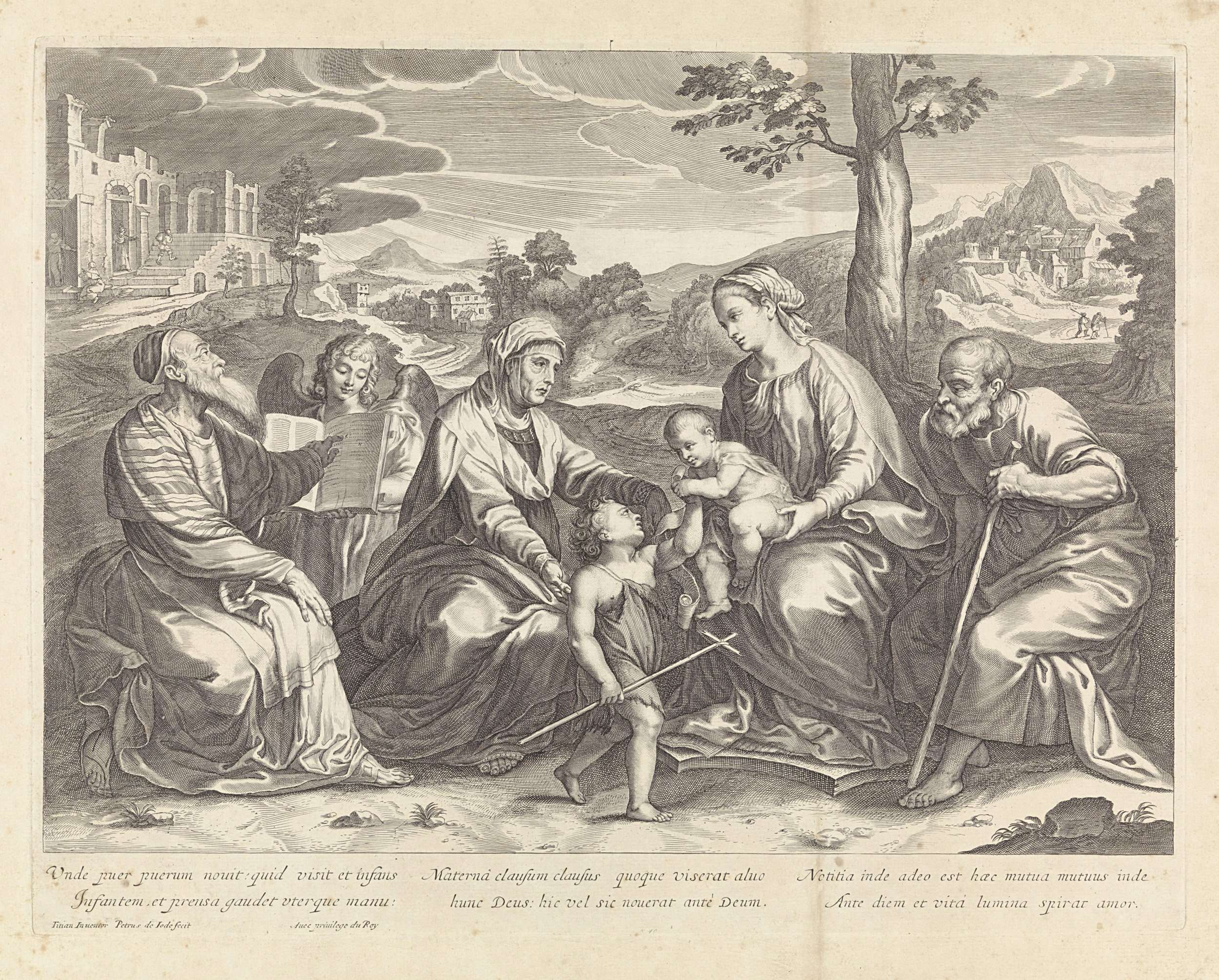 Landschap met Heilige Familie en andere heiligen
