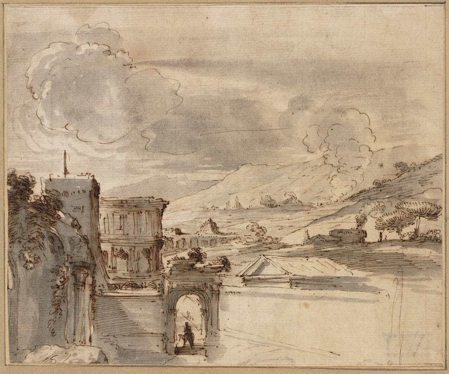 Landschap met tekenaar bij tempelruïnes