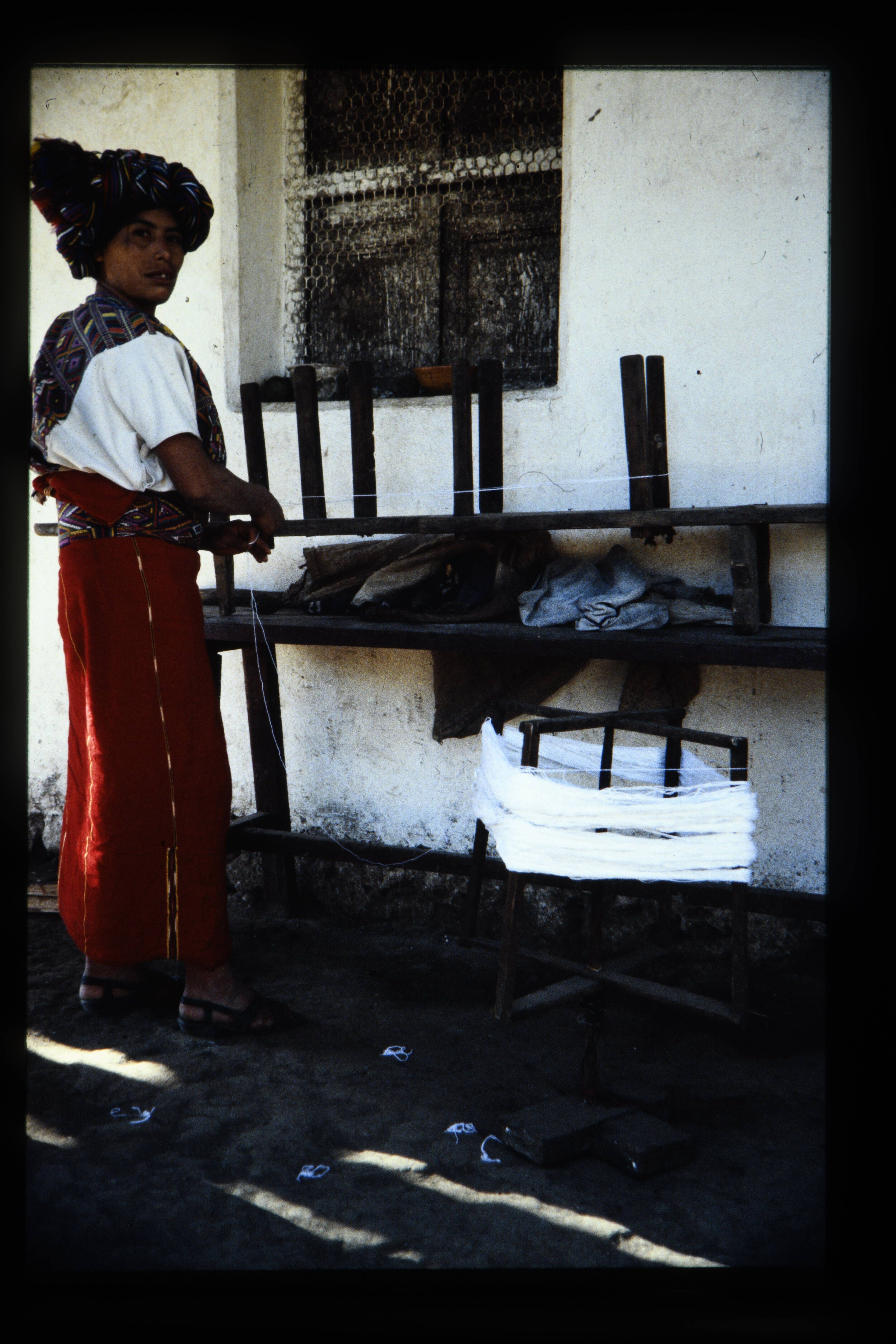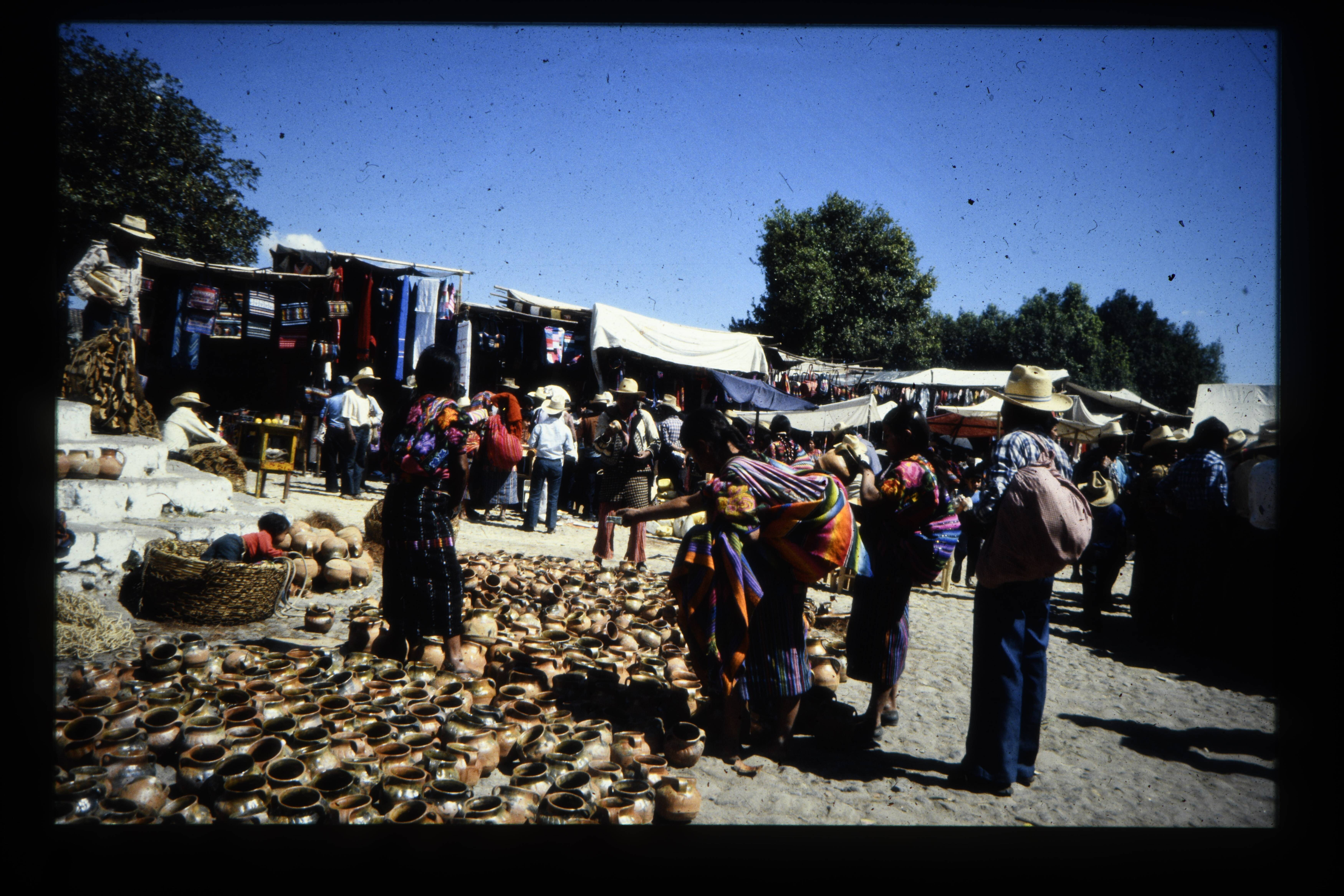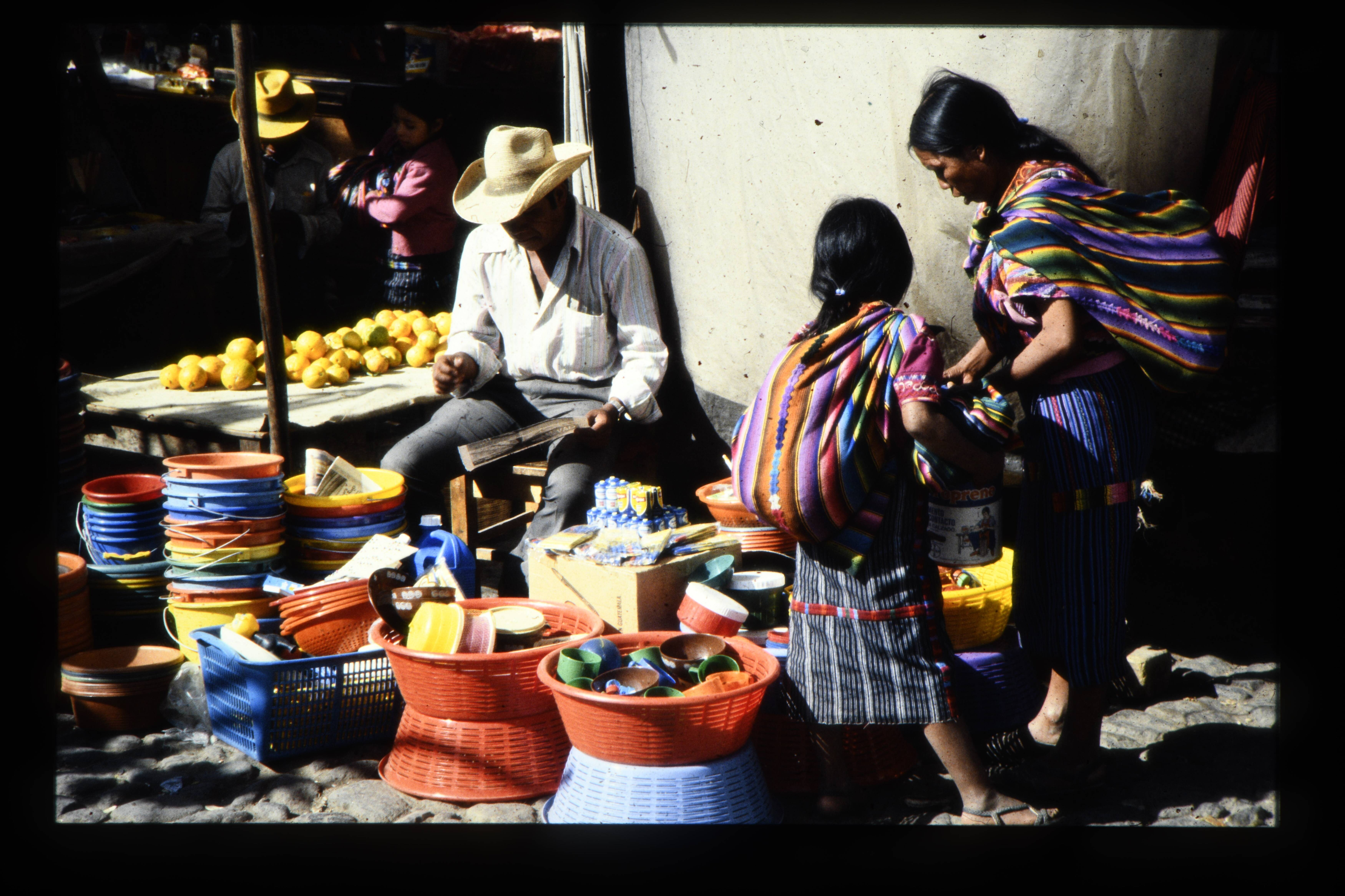 'De verkoop van geweven stoffen. Meer van Atitlán.'