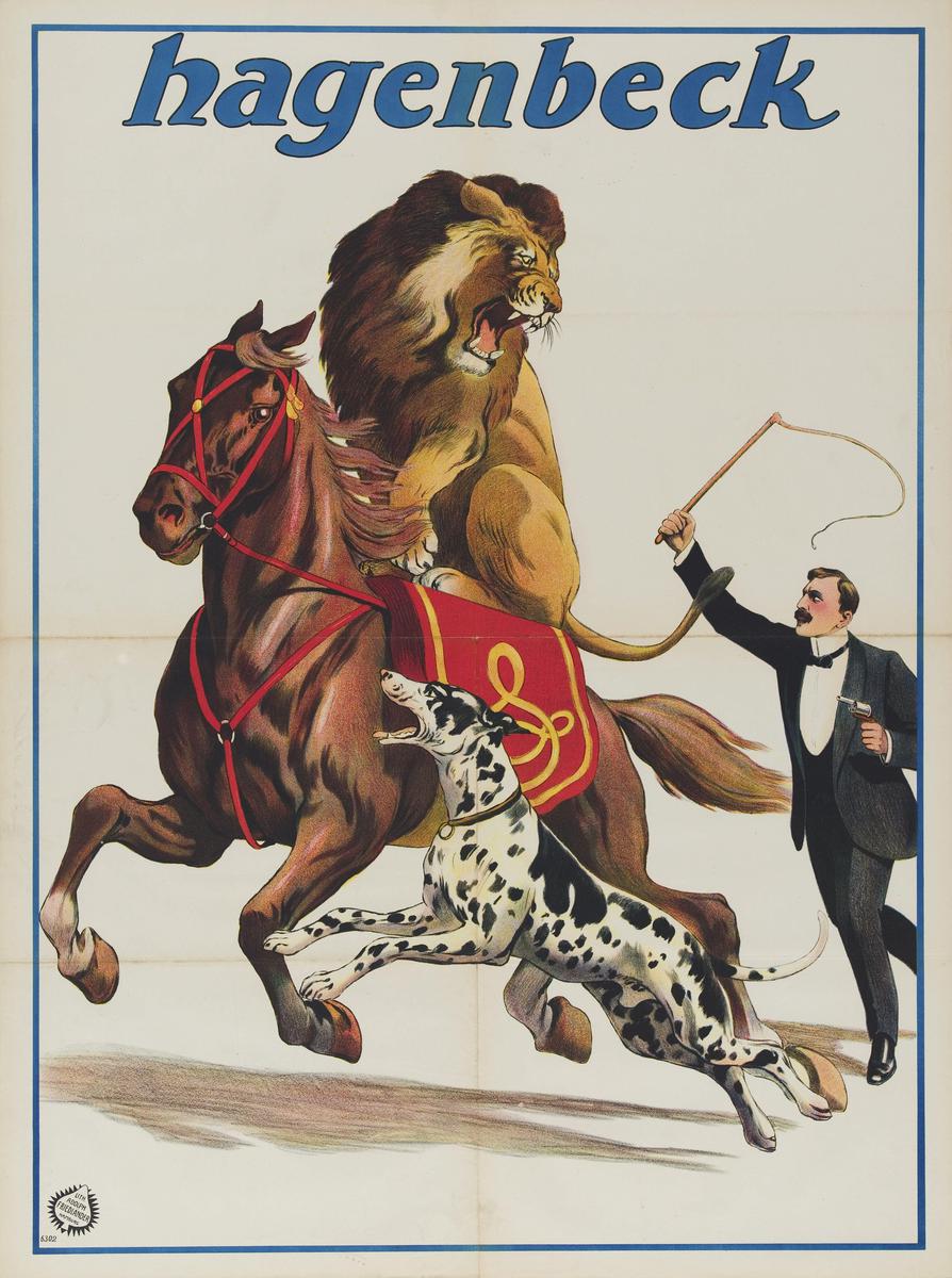 Leeuw op paard en Deense dog met dresseur